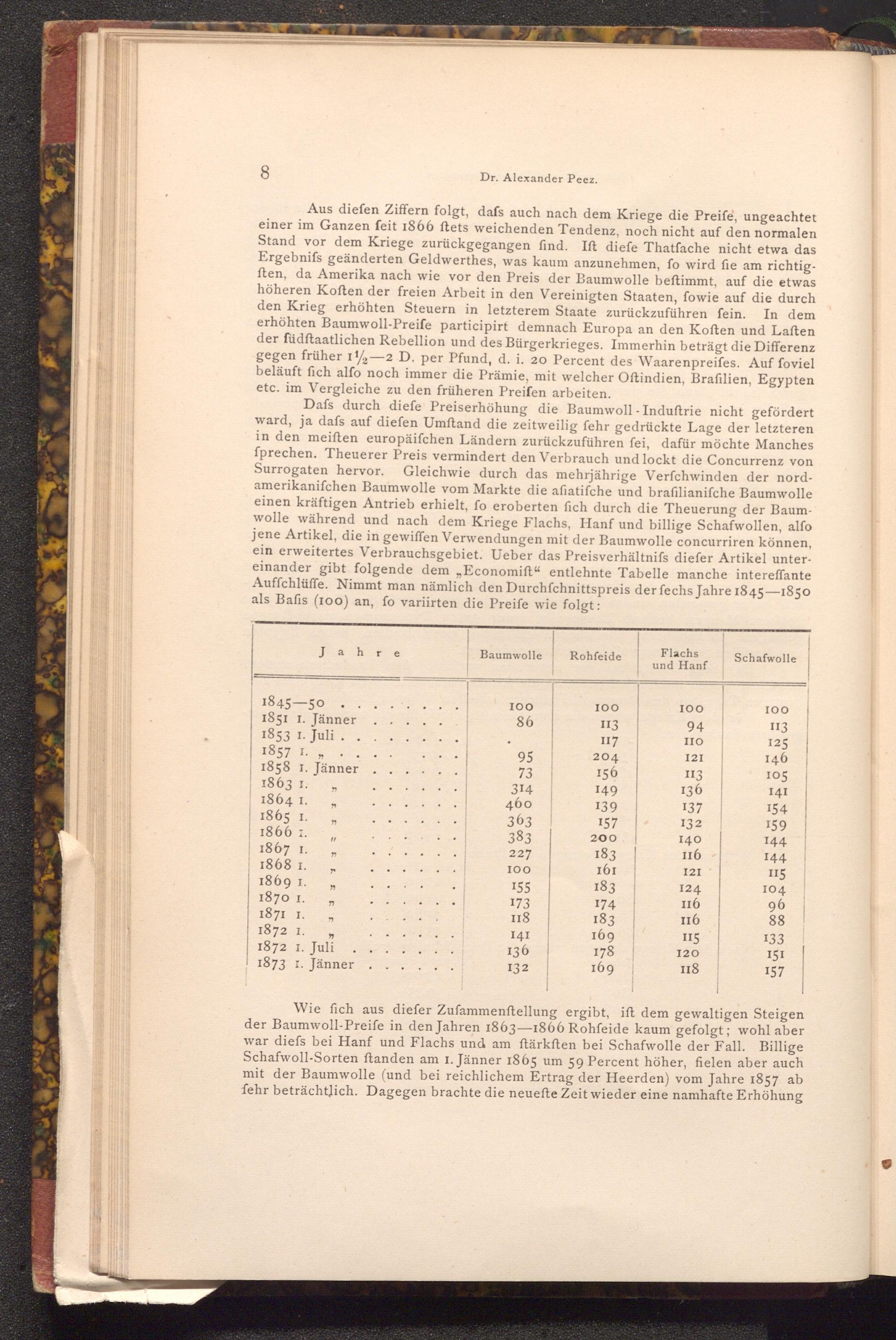 Aus diefen Ziffern folgt, dafs auch nach dem Kriege die Preife, ungeachtet einer im Ganzen feit 1866 ftets weichenden Tendenz, noch nicht auf den normalen Stand vor dem Kriege zurückgegangen find. Ift diefe Thatfache nicht etwa das Ergebniſs geänderten Geldwerthes, was kaum anzunehmen, fo wird fie am richtigften, da Amerika nach wie vor den Preis der Baumwolle beſtimmt, auf die etwas höheren Koften der freien Arbeit in den Vereinigten Staaten, fowie auf die durch den Krieg erhöhten Steuern in letzterem Staate zurückzuführen fein. In dem erhöhten Baumwoll- Preife participirt demnach Europa an den Koften und Laften der füdftaatlichen Rebellion und des Bürgerkrieges. Immerhin beträgt die Differenz gegen früher 12-2 D. per Pfund, d. i. 20 Percent des Waarenpreifes. Auf foviel beläuft fich alfo noch immer die Prämie, mit welcher Oftindien, Brafilien, Egypten etc. im Vergleiche zu den früheren Preifen arbeiten.