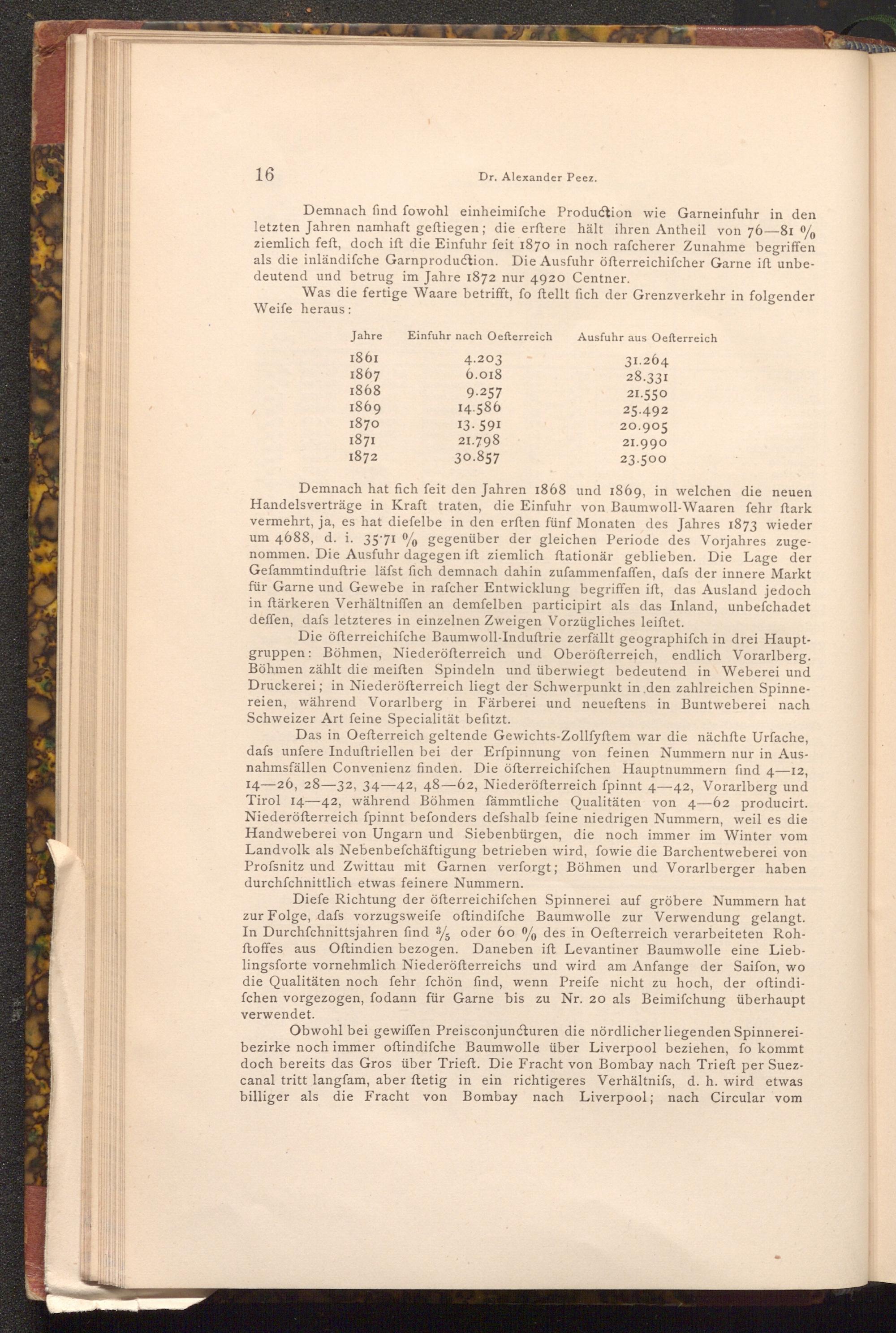 Diefe Richtung der öfterreichifchen Spinnerei auf gröbere Nummern hat zur Folge, dafs vorzugsweife oftindifche Baumwolle zur Verwendung gelangt. In Durchfchnittsjahren find/ oder 60% des in Oefterreich verarbeiteten Rohftoffes aus Oftindien bezogen. Daneben ift Levantiner Baumwolle eine Lieblingsforte vornehmlich Niederöfterreichs und wird am Anfange der Saifon, wo die Qualitäten noch fehr fchön find, wenn Preife nicht zu hoch, der oftindifchen vorgezogen, fodann für Garne bis zu Nr. 20 als Beimifchung überhaupt verwendet.