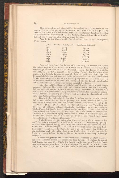 Demnach hat fich feit den Jahren 1868 und 1869, in welchen die neuen Handelsverträge in Kraft traten, die Einfuhr von Baumwoll- Waaren fehr ftark vermehrt, ja, es hat diefelbe in den erften fünf Monaten des Jahres 1873 wieder um 4688, d. i. 35.71% gegenüber der gleichen Periode des Vorjahres zugenommen. Die Ausfuhr dagegen ift ziemlich ftationär geblieben. Die Lage der Gefammtinduftrie läfst fich demnach dahin zufammenfaffen, dafs der innere Markt für Garne und Gewebe in rafcher Entwicklung begriffen ift, das Ausland jedoch in ftärkeren Verhältniffen an demfelben participirt als das Inland, unbefchadet deffen, dafs letzteres in einzelnen Zweigen Vorzügliches leiftet.