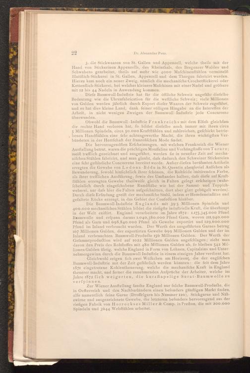 Diefe Baumwoll- Induftrie hat für die öftliche Schweiz ungefähr diefelbe Bedeutung wie die Uhrenfabrication für die weftliche Schweiz; viele Millionen von Gulden werden jährlich durch Export diefer Waaren der Schweiz zugeführt, und es hat dies kleine Land, dank feiner völligen Hingabe an die Intereffen der Arbeit, in nicht wenigen Zweigen der Baumwoll- Induftrie jede Concurrenz überwunden.