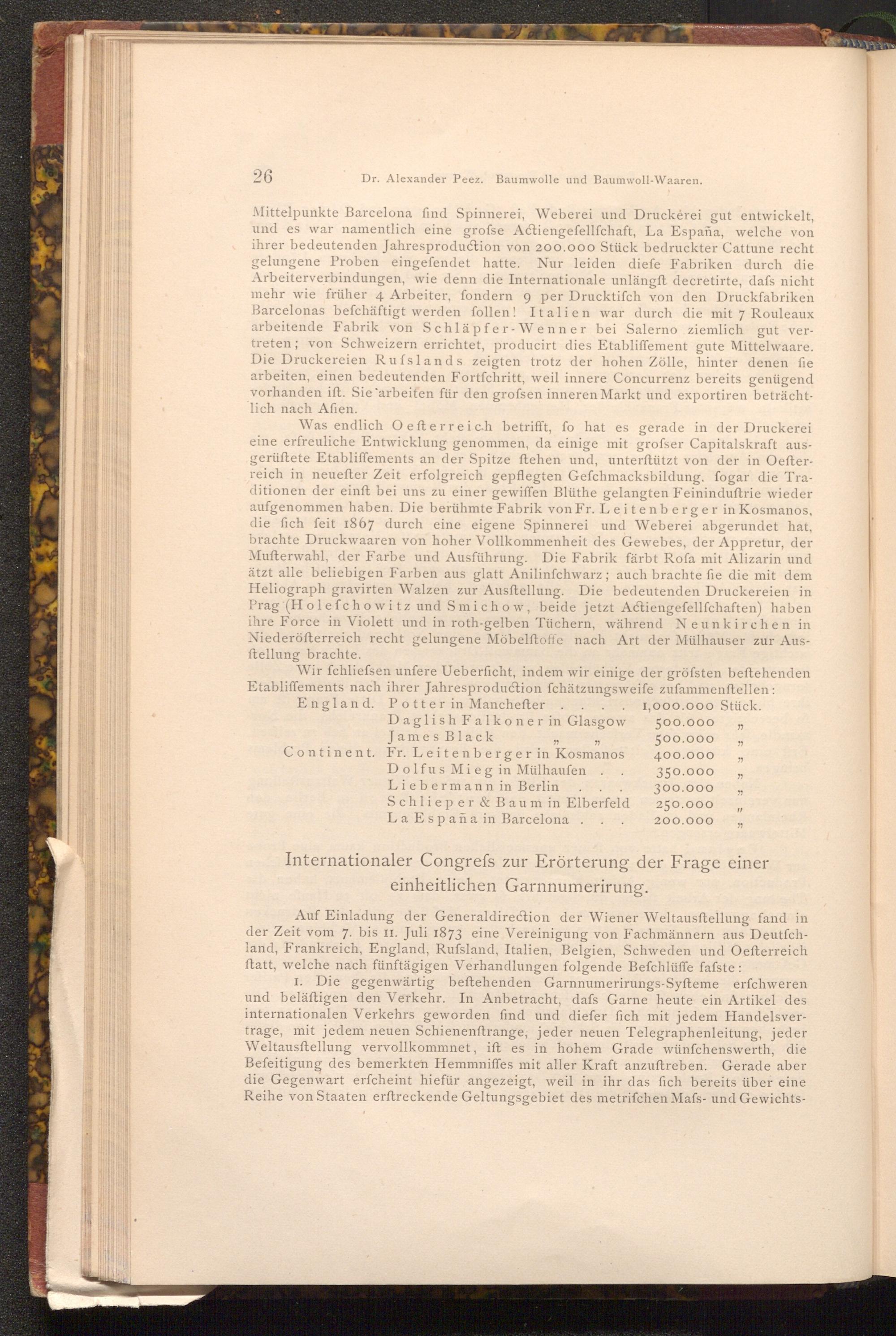 Mittelpunkte Barcelona find Spinnerei, Weberei und Druckerei gut entwickelt, und es war namentlich eine grofse Actiengeſellſchaft, La España, welche von ihrer bedeutenden Jahresproduction von 200.000 Stück bedruckter Cattune recht gelungene Proben eingefendet hatte. Nur leiden diefe Fabriken durch die Arbeiterverbindungen, wie denn die Internationale unlängft decretirte, dafs nicht. mehr wie früher 4 Arbeiter, fondern 9 per Drucktifch von den Druckfabriken Barcelonas befchäftigt werden follen! Italien war durch die mit 7 Rouleaux arbeitende Fabrik von Schläpfer- Wenner bei Salerno ziemlich gut vertreten; von Schweizern errichtet, producirt dies Etabliffement gute Mittelwaare. Die Druckereien Rufslands zeigten trotz der hohen Zölle, hinter denen fie arbeiten, einen bedeutenden Fortfchritt, weil innere Concurrenz bereits genügend vorhanden ift. Sie arbeiten für den grofsen inneren Markt und exportiren beträchtlich nach Afien.