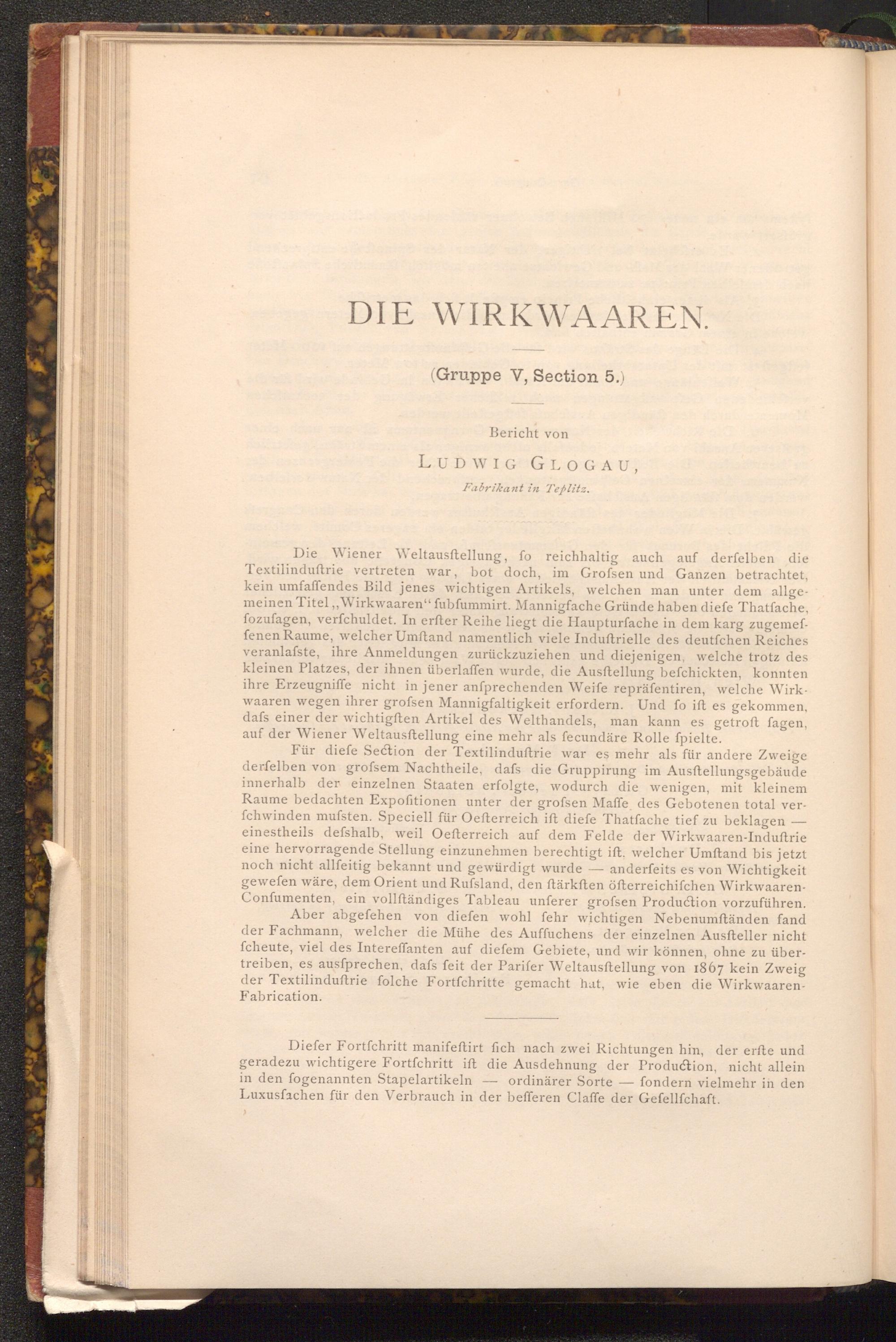 Für diefe Section der Textilinduftrie war es mehr als für andere Zweige derfelben von grofsem Nachtheile, dafs die Gruppirung im Ausftellungsgebäude innerhalb der einzelnen Staaten erfolgte, wodurch die wenigen, mit kleinem Raume bedachten Expofitionen unter der grofsen Maffe des Gebotenen total verfchwinden mufsten. Speciell für Oefterreich ift diefe Thatfache tief zu beklagen einestheils defshalb, weil Oefterreich auf dem Felde der Wirkwaaren- Induftrie eine hervorragende Stellung einzunehmen berechtigt ift, welcher Umftand bis jetzt noch nicht allfeitig bekannt und gewürdigt wurde anderfeits es von Wichtigkeit gewefen wäre, dem Orient und Rufsland, den ftärksten öfterreichifchen WirkwaarenConfumenten, ein vollſtändiges Tableau unferer grofsen Production vorzuführen. Aber abgefehen von diefen wohl fehr wichtigen Nebenumftänden fand der Fachmann, welcher die Mühe des Auffuchens der einzelnen Ausfteller nicht fcheute, viel des Intereffanten auf diefem Gebiete, und wir können, ohne zu übertreiben, es ausfprechen, dafs feit der Parifer Weltausftellung von 1867 kein Zweig der Textilinduftrie folche Fortfchritte gemacht hat, wie eben die Wirkwaaren