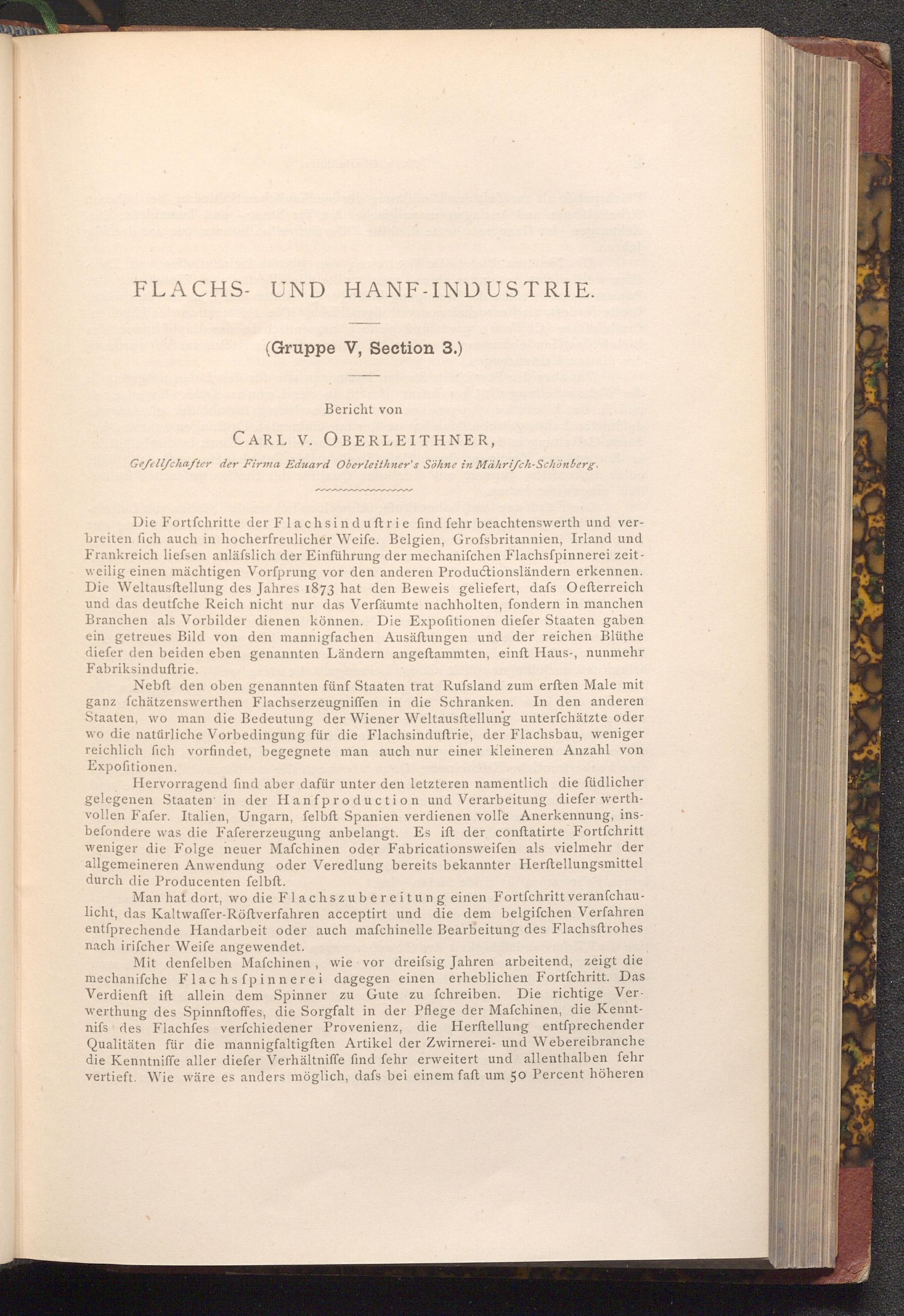 Die Fortfchritte der Flachsinduftrie find fehr beachtenswerth und verbreiten fich auch in hocherfreulicher Weife. Belgien, Grofsbritannien, Irland und Frankreich liefsen anlässlich der Einführung der mechanifchen Flachsfpinnerei zeitweilig einen mächtigen Vorfprung vor den anderen Productionsländern erkennen. Die Weltausftellung des Jahres 1873 hat den Beweis geliefert, dafs Oefterreich und das deutfche Reich nicht nur das Verfäumte nachholten, fondern in manchen Branchen als Vorbilder dienen können. Die Expofitionen diefer Staaten gaben ein getreues Bild von den mannigfachen Ausäftungen und der reichen Blüthe diefer den beiden eben genannten Ländern angeftammten, einft Haus-, nunmehr Fabriksinduftrie.
