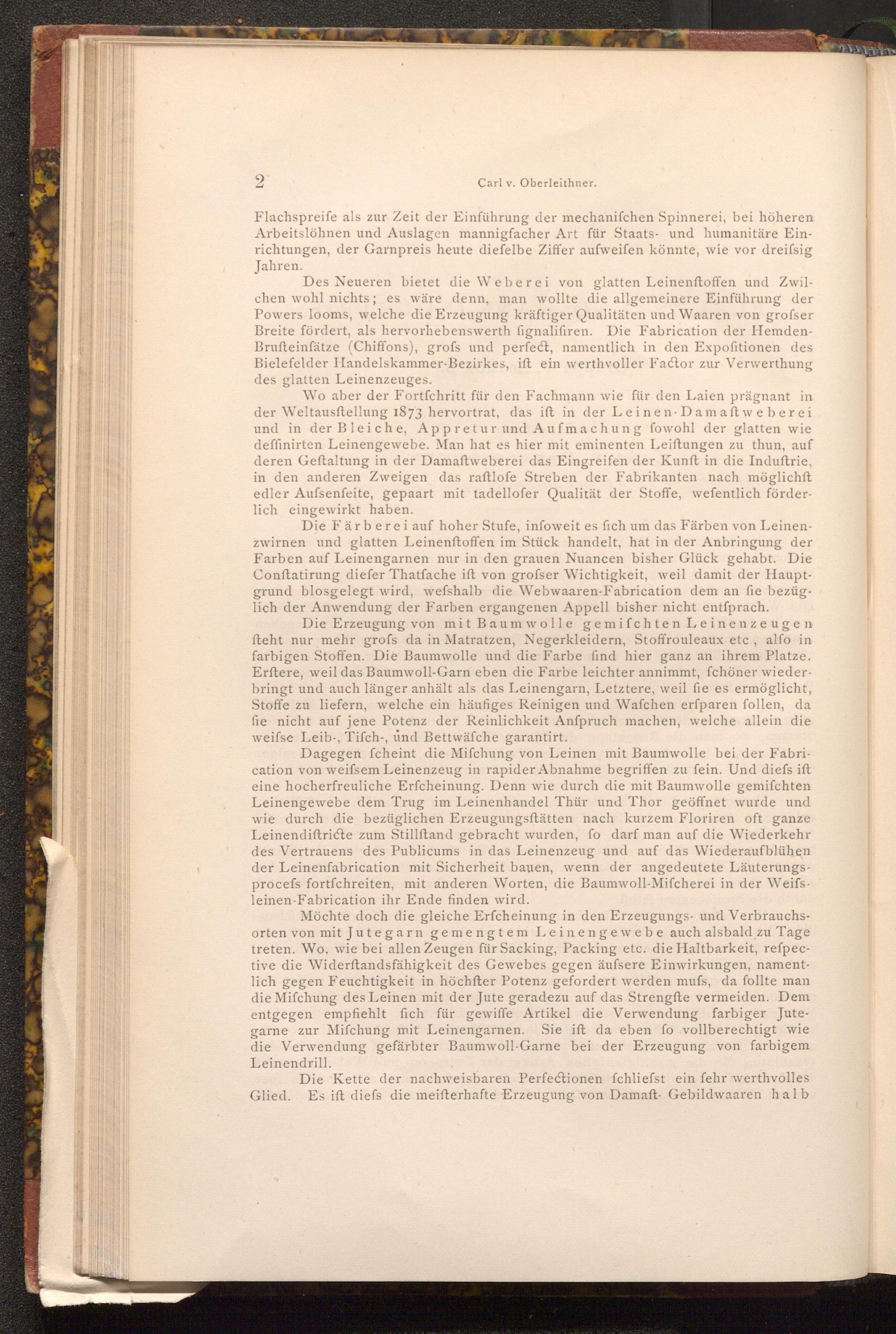 Die Erzeugung von mit Baumwolle gemifchten Leinenzeugen fteht nur mehr grofs da in Matratzen, Negerkleidern, Stoffrouleaux etc, alfo in farbigen Stoffen. Die Baumwolle und die Farbe find hier ganz an ihrem Platze. Erftere, weil das Baumwoll- Garn eben die Farbe leichter annimmt, fchöner wieder. bringt und auch länger anhält als das Leinengarn, Letztere, weil fie es ermöglicht, Stoffe zu liefern, welche ein häufiges Reinigen und Wafchen erfparen follen, da fie nicht auf jene Potenz der Reinlichkeit Anfpruch machen, welche allein die weifse Leib-, Tifch-, und Bettwäsche garantirt.
