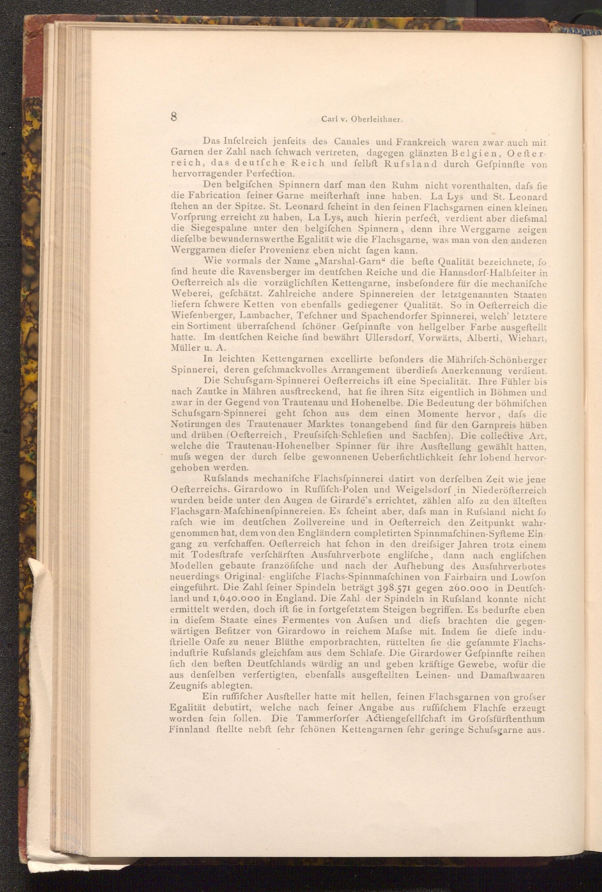 Ein ruffifcher Ausfteller hatte mit hellen, feinen Flachsgarnen von grofser Egalität debutirt, welche nach feiner Angabe aus ruffifchem Flachfe erzeugt worden fein follen. Die Tammerforfer Actiengeſellſchaft im Grofsfürftenthum Finnland ftellte nebft fehr fchönen Kettengarnen fehr geringe Schufsgarne aus.