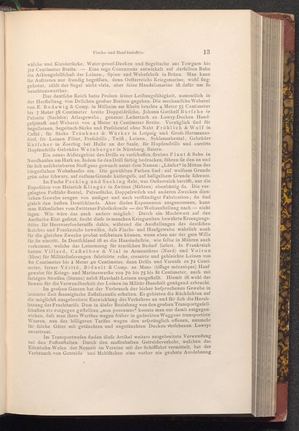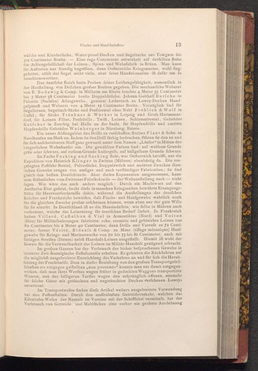Das deutfche Reich hatte Proben feiner Leiftungsfähigkeit, namentlich in der Herftellung von Drilchen grofser Breiten gegeben. Die mechanifche Weberei von E. Bodewig& Comp. in Mülheim am Rhein brachte 4 Meter 55 Centimeter bis 7 Meter 58 Centimeter breite Doppeldrilche, Johann Gotthelf Burfche in Pulsnitz( Sachfen) Atlasgewebe, genannt Ledertuch zu Lowry- Decken Handgefpinnft und Weberei von 4 Meter 12 Centimeter Breite. Vorzüglich find für Segelleinen, Segeltuch- Säcke und Prefsbeutel ohne Naht Fröhlich& Wolf in Caffel, für Säcke Tränkner& Würker in Leipzig und Grofs- Hartmannsdorf, für Leinen Filter, Prefsdrills, Twift, Leinen, Schlammbeutel, Gebrüder Kutfcher in Zoerbig bei Halle an der Saale, für Hopfendrills und carrirte Hopfendrills Gebrüder Weinberger in Nürnberg, Baiern.