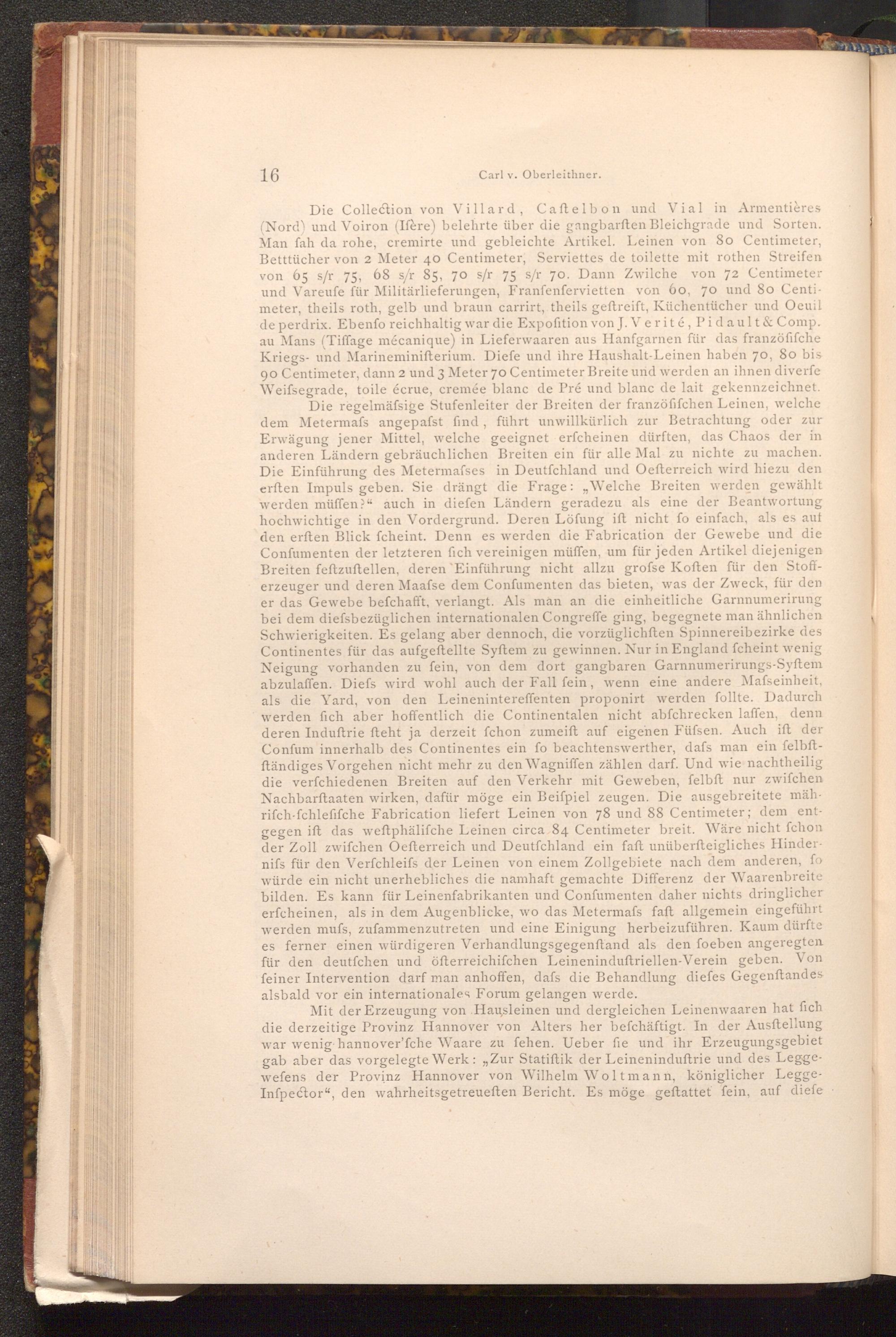 Die Collection von Villard, Caftelbon und Vial in Armentières ( Nord) und Voiron( Ifère) belehrte über die gangbarften Bleichgrade und Sorten. Man fah da rohe, cremirte und gebleichte Artikel. Leinen von 80 Centimeter, Betttücher von 2 Meter 40 Centimeter, Serviettes de toilette mit rothen Streifen von 65 s/ r 75, 68 s/ r 85, 70 s/ r 75 s/ r 70. Dann Zwilche von 72 Centimeter und Vareufe für Militärlieferungen, Franfenfervietten von 60, 70 und 80 Centimeter, theils roth, gelb und braun carrirt, theils geftreift, Küchentücher und Oeuil de perdrix. Ebenfo reichhaltig war die Expofition von J. Verité, Pidault& Comp. au Mans( Tiffage mécanique) in Lieferwaaren aus Hanfgarnen für das franzöfifche Kriegs- und Marineminifterium. Diefe und ihre Haushalt- Leinen haben 70, 80 bis 90 Centimeter, dann 2 und 3 Meter 70 Centimeter Breite und werden an ihnen diverfe Weifsegrade, toile écrue, cremée blanc de Pré und blanc de lait gekennzeichnet. Die regelmäfsige Stufenleiter der Breiten der franzöfifchen Leinen, welche dem Metermafs angepafst find, führt unwillkürlich zur Betrachtung oder zur Erwägung jener Mittel, welche geeignet erfcheinen dürften, das Chaos der in anderen Ländern gebräuchlichen Breiten ein für alle Mal zu nichte zu machen. Die Einführung des Metermafses in Deutfchland und Oefterreich wird hiezu den erften Impuls geben. Sie drängt die Frage: Welche Breiten werden gewählt werden müffen?" auch in diefen Ländern geradezu als eine der Beantwortung hochwichtige in den Vordergrund. Deren Löfung ift nicht fo einfach, als es auf den erften Blick fcheint. Denn es werden die Fabrication der Gewebe und die Confumenten der letzteren fich vereinigen müffen, um für jeden Artikel diejenigen Breiten feftzuftellen, deren Einführung nicht allzu grofse Koften für den Stofferzeuger und deren Maafse dem Confumenten das bieten, was der Zweck, für den er das Gewebe befchafft, verlangt. Als man an die einheitliche Garnnumerirung bei dem diefsbezüglichen internationalen Congreffe ging, begegnete man ähnlichen Schwierigkeiten. Es gelang aber dennoch, die vorzüglichften Spinnereibezirke des Continentes für das aufgeftellte Syftem zu gewinnen. Nur in England fcheint wenig Neigung vorhanden zu fein, von dem dort gangbaren Garnnumerirungs- Syftem abzulaffen. Diefs wird wohl auch der Fall fein, wenn eine andere Mafseinheit, als die Yard, von den Leinenintereffenten proponirt werden follte. Dadurch werden fich aber hoffentlich die Continentalen nicht abfchrecken laffen, denn deren Induftrie fteht ja derzeit fchon zumeift auf eigenen Füfsen. Auch ift der Confum innerhalb des Continentes ein fo beachtenswerther, dafs man ein felbftftändiges Vorgehen nicht mehr zu den Wagniffen zählen darf. Und wie nachtheilig die verfchiedenen Breiten auf den Verkehr mit Geweben, felbft nur zwifchen Nachbarftaaten wirken, dafür möge ein Beiſpiel zeugen. Die ausgebreitete mährifch- fchlefifche Fabrication liefert Leinen von 78 und 88 Centimeter; dem entgegen ift das weftphälifche Leinen circa 84 Centimeter breit. Wäre nicht fchon der Zoll zwifchen Oefterreich und Deutfchland ein faft unüberfteigliches Hindernifs für den Verfchleifs der Leinen von einem Zollgebiete nach dem anderen, fo würde ein nicht unerhebliches die namhaft gemachte Differenz der Waarenbreite bilden. Es kann für Leinenfabrikanten und Confumenten daher nichts dringlicher erfcheinen, als in dem Augenblicke, wo das Metermafs faft allgemein eingeführt werden mufs, zufammenzutreten und eine Einigung herbeizuführen. Kaum dürfte es ferner einen würdigeren Verhandlungsgegenstand als den foeben angeregten für den deutfchen und öfterreichifchen Leineninduftriellen- Verein geben. Von feiner Intervention darf man anhoffen, dafs die Behandlung diefes Gegenftandes alsbald vor ein internationales Forum gelangen werde.