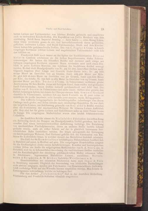 Im deutfchen Reiche nimmt die Bielefelder Fabrication den erften Rang ein. Zeitweilig durch das Hangen am Handgefpinnft in Verfall gerathen, hat fie in neuefter Zeit einen bewundernswerthen Auffchwung bethätigt. Die Errichtung von mechanifchen Flachsfpinnereien, deren an anderer Stelle bereits lobend gedacht wurde, mufs als erfter Schritt auf der fo glücklich betretenen fortfchrittlichen Bahn bezeichnet werden. Ihr folgte naturgemäfs der Uebergang zur fabriksmäfsigen Weberei. Und fördernd gefellte fich die Fabrication von Einfätzen für Leibwäfche hinzu, in welcher derzeit das Bielefelder Gefchäft culminirt. Die Zahl der für Hemdeinfätze befchäftigten Nähmafchinen beziffert fich in Bielefeld auf 2200, in Herfort auf 400. Die vorgelegten Hemdeinfätze zeugten für die Grofsartigkeit diefes neuen Induftriezweiges. Erwähnt und hervorgehoben werden follen zur Stelle die aufgelegenen Mufterbücher von S. A. Stern sen. in Bielefeld, weil fie in fyftematiſcher Anordnung die verfchiedenen Deffins darftellen und die Reichhaltigkeit der durchweg gefchmackvollen Mufter erkennen laffen. In Stückwaare, fogenannten Bielefelder Leinen, excellirten Bertels mann& Bergmann, A. W. Kisker, Gebrüder Wertheimer u. A.