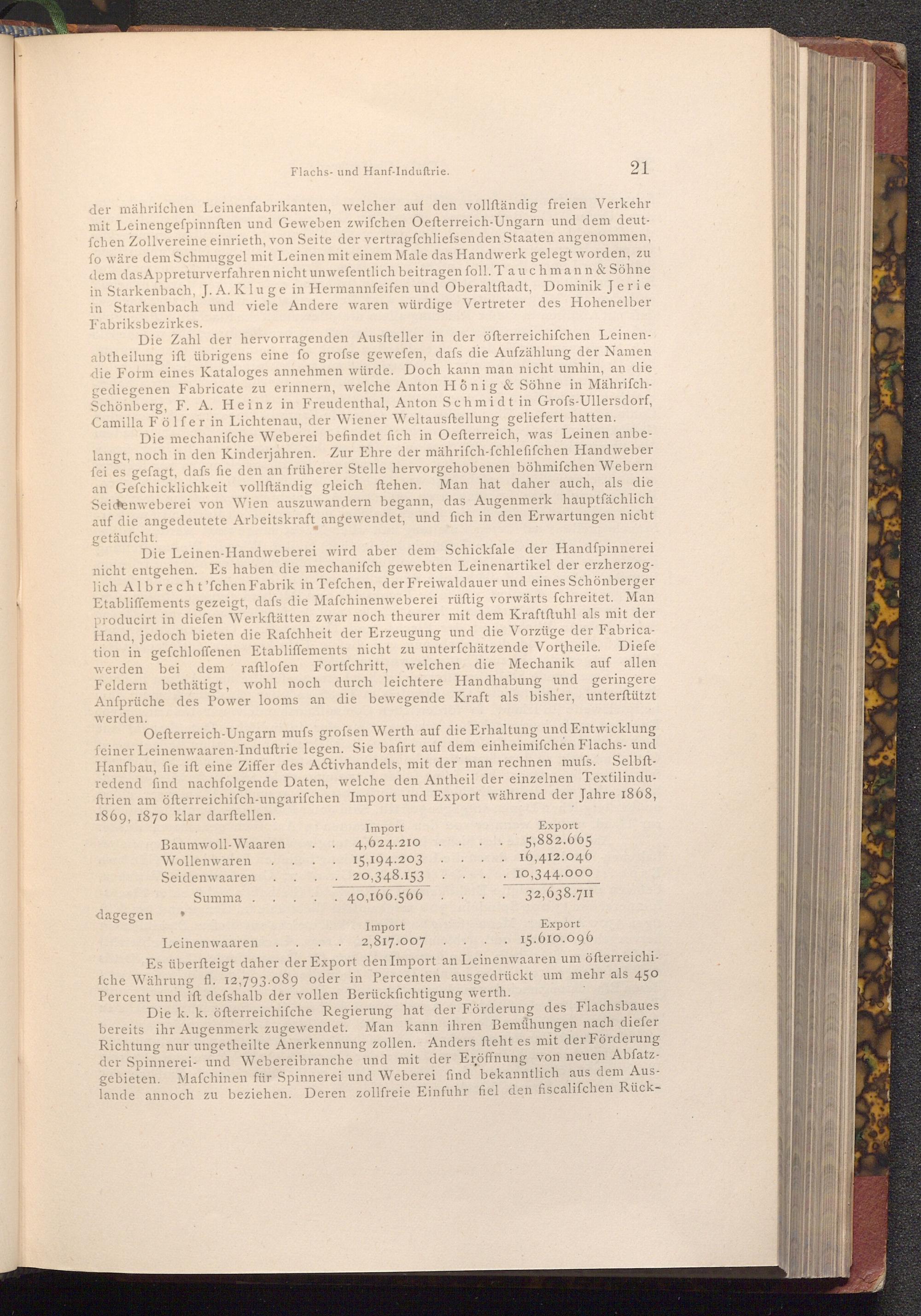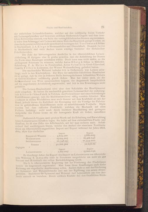 Es überfteigt daher der Export den Import an Leinenwaaren um öfterreichifche Währung fl. 12,793.089 oder in Percenten ausgedrückt um mehr als 450 Percent und ift defshalb der vollen Berücksichtigung werth.