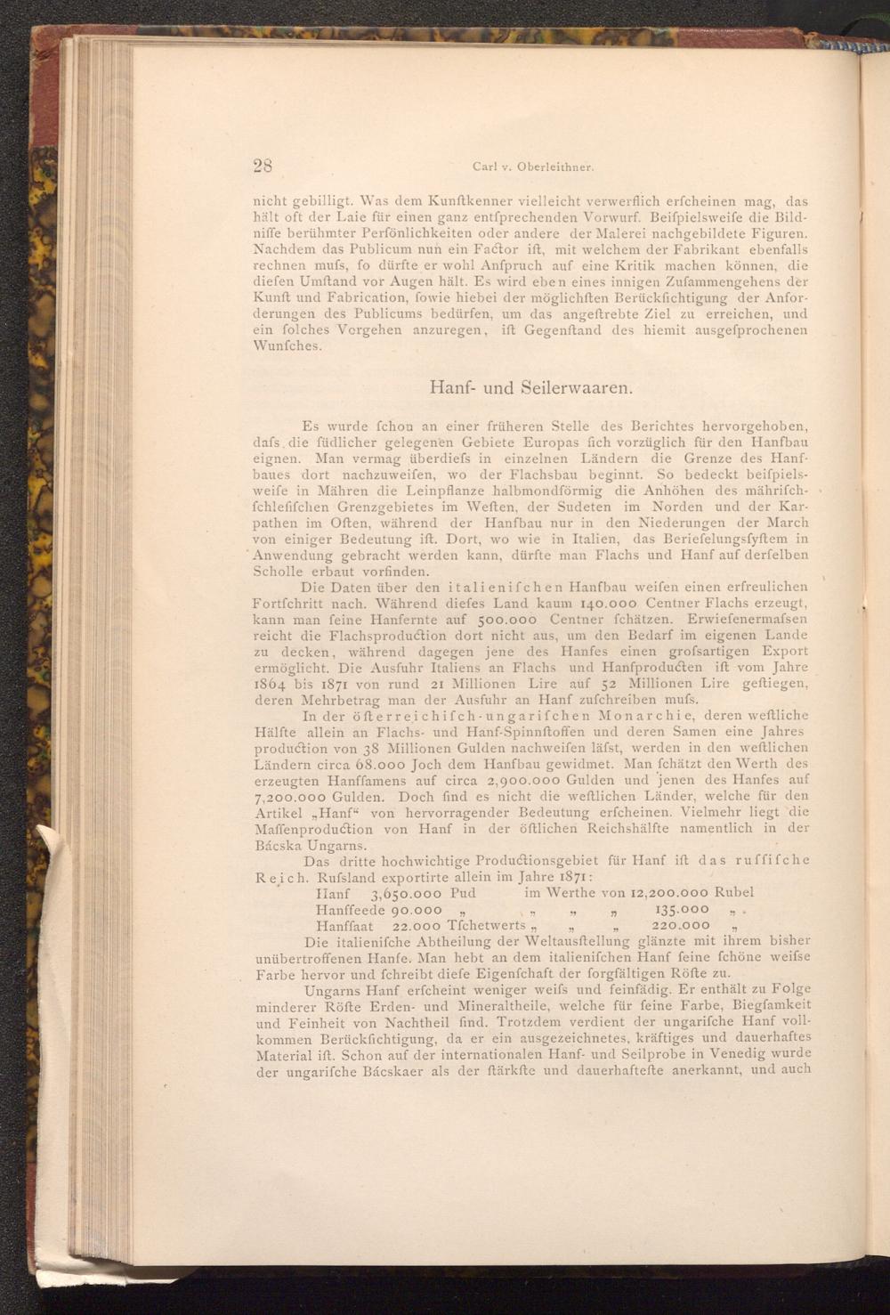 Die italienifche Abtheilung der Weltausftellung glänzte mit ihrem bisher unübertroffenen Hanfe. Man hebt an dem italienifchen Hanf feine fchöne weifse Farbe hervor und fchreibt diefe Eigenfchaft der forgfältigen Röfte zu.