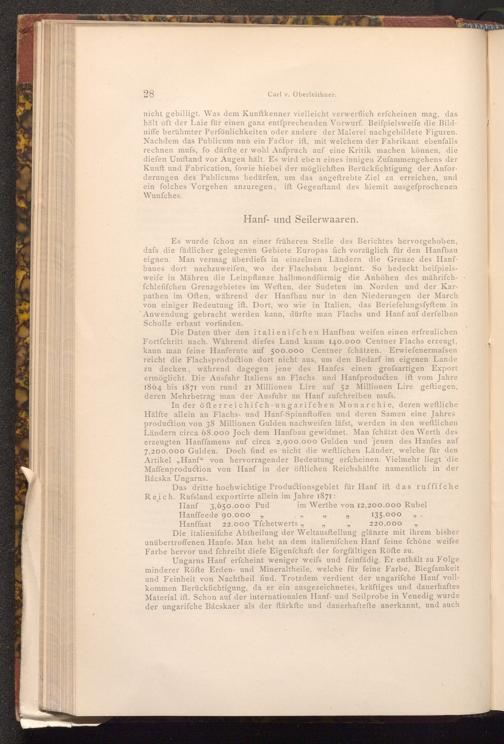 Ungarns Hanf erfcheint weniger weifs und feinfädig. Er enthält zu Folge minderer Röfte Erden- und Mineraltheile, welche für feine Farbe, Biegfamkeit und Feinheit von Nachtheil find. Trotzdem verdient der ungarifche Hanf vollkommen Berücksichtigung, da er ein ausgezeichnetes, kräftiges und dauerhaftes Material ift. Schon auf der internationalen Hanf- und Seilprobe in Venedig wurde der ungarifche Bácskaer als der ftärkfte und dauerhaftefte anerkannt, und auch