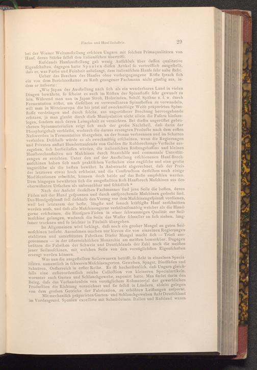 Was nun die ausgeftellten Seilerwaaren betrifft, fo fteht in einzelnen Specia litäten, namentlich in fchweren Mafchinengurten, Geweben, Spagat, Bindfäden und Schnüren, Oefterreich in erfter Reihe. Es ift hocherfreulich, dafs Ungarn gleichfalls eine aufserordentlich reiche Collection von kleineren Specialartikeln, worunter auch Gurten und Schlauchgewebe, exponirt hatte. Man findet darin den Beleg, dafs das Vorhandenfein von vorzüglichem Rohmaterial der gewerblichen Production die Richtung vorzeichnet und fie felbft in Ländern, abfeits gelegen von dem grofsen Getriebe der Fabrication, zu erhöhten Leiftungen anfpornt. Mit mechanifch präparirten Gurten- und Schlauchgeweben fteht Deutſchland im Vordergrund. Spanien excellirte mit Schnürleinen. Italien und Rufsland waren
