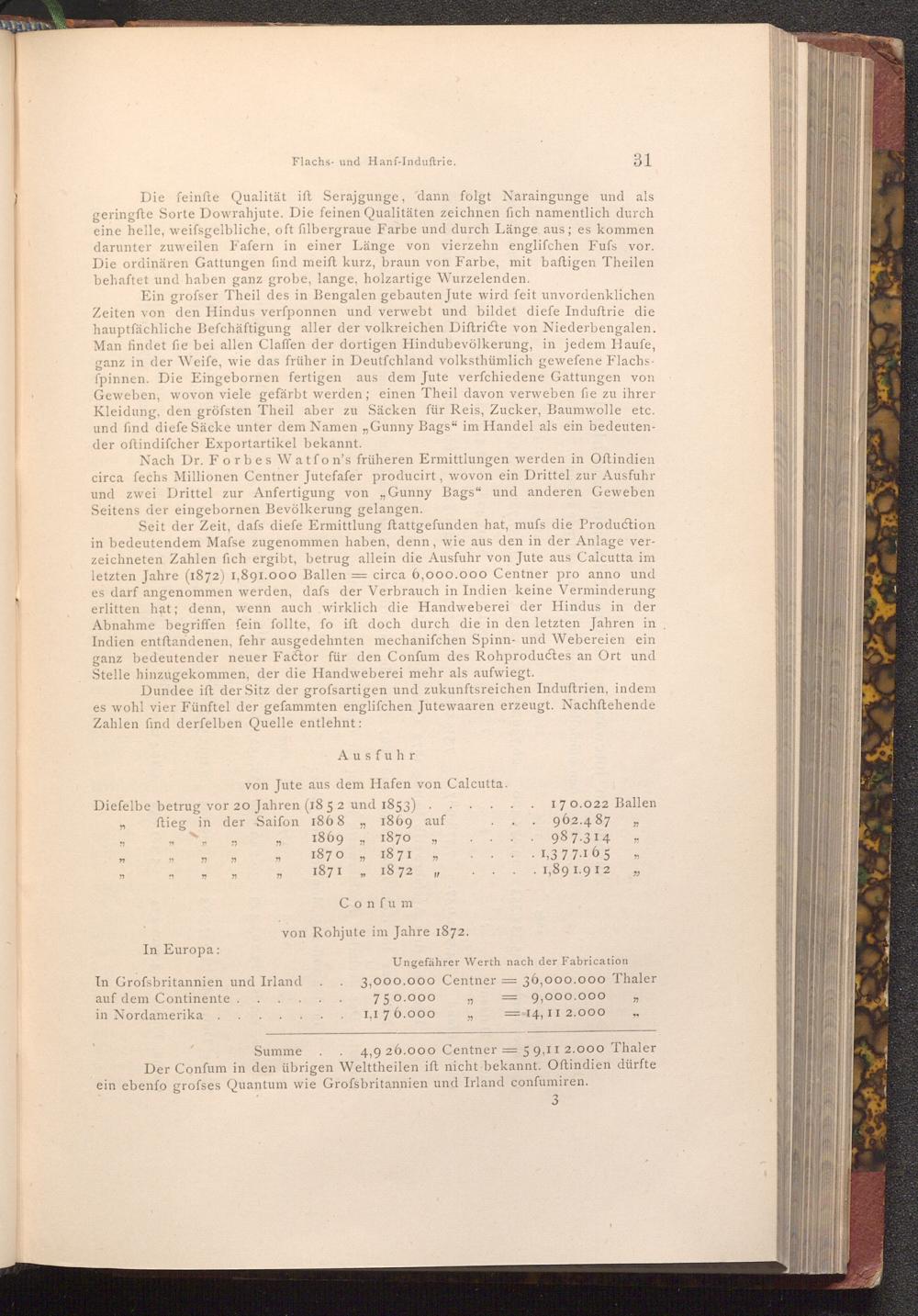 Seit der Zeit, dafs diefe Ermittlung ftattgefunden hat, mufs die Production in bedeutendem Mafse zugenommen haben, denn, wie aus den in der Anlage verzeichneten Zahlen fich ergibt, betrug allein die Ausfuhr von Jute aus Calcutta im letzten Jahre( 1872) 1,891.000 Ballen circa 6,000.000 Centner pro anno und es darf angenommen werden, dafs der Verbrauch in Indien keine Verminderung erlitten hat; denn, wenn auch wirklich die Handweberei der Hindus in der Abnahme begriffen fein follte, fo ift doch durch die in den letzten Jahren in. Indien entstandenen, fehr ausgedehnten mechanifchen Spinn- und Webereien ein ganz bedeutender neuer Factor für den Confum des Rohproductes an Ort und Stelle hinzugekommen, der die Handweberei mehr als aufwiegt.