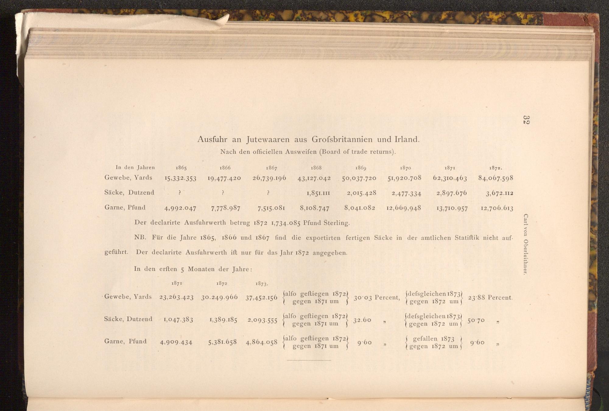 NB. Für die Jahre 1865, 1866 und 1867 find die exportirten fertigen Säcke in der amtlichen Statiſtik nicht aufgeführt. Der declarirte Ausfuhrwerth ift nur für das Jahr 1872 angegeben.