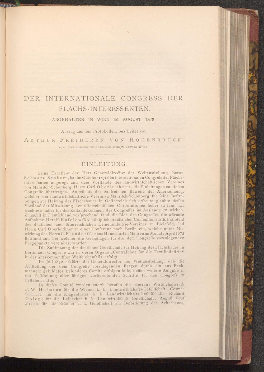 Seine Excellenz der Herr Generaldirector der Weltausftellung, Baron Schwarz- Senborn, hat im October 1871 den internationalen Congrefs der Flachsintereffenten angeregt und dem Vorftande des landwirthschaftlichen Vereines von Mährifch- Schönberg, Herrn Carl Oberleithner, die Einleitungen zu diefem Congreffe übertragen. Angefichts der zahlreichen Beweife der Anerkennung, welcher der landwirthfchaftliche Verein zu Mährifch- Schönberg für feine Beftrebungen zur Hebung des Flachsbaues in Oefterreich fich erfreute, glaubte deffen Vorftand der Mitwirkung der öfterreichifchen Corporationen ficher zu fein. Er trachtete daher für das Zuftandekommen des Congreffes im Auslande zu wirken. Zunächft in Deutfchland vorfprechend fand die Idee des Congreffes die wärmfte Aufnahme. Herr F. Kafelowfky, königlich preufsifcher Commiffionsrath, Präfident des deutfchen und öfterreichifchen Leineninduftrie- Vereines zu Bielefeld, lud Herrn Carl Oberleithner zu einer Conferenz nach Berlin ein, welche unter Mitwirkung des Herrn C. Flandorffer aus Hannsdorf in Mähren im Monate April 1872 ftattfand und bei welcher die Grundlagen für die dem Congreffe vorzulegenden Fragepunkte vereinbart wurden.