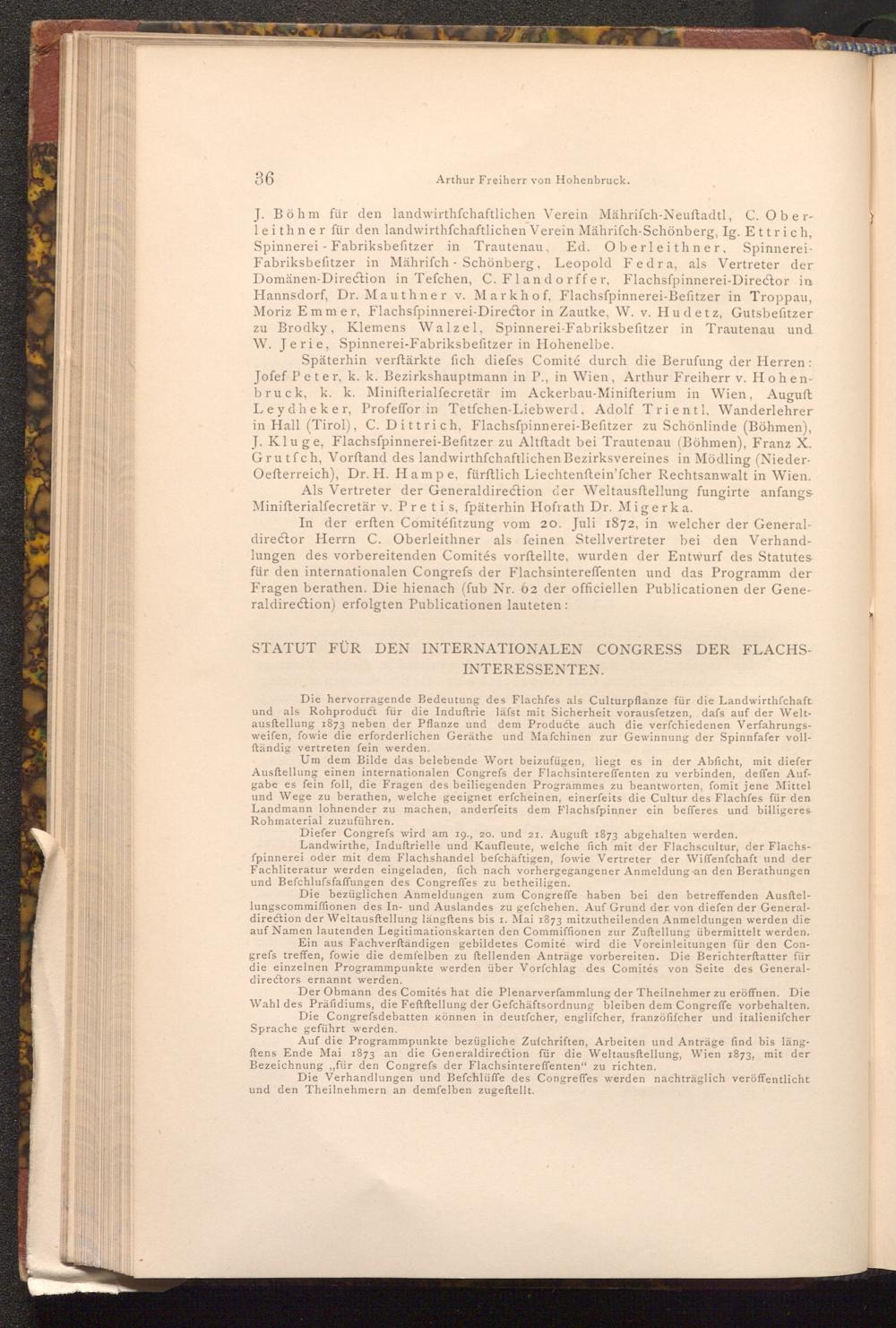 In der erften Comitéfitzung vom 20. Juli 1872, in welcher der Generaldirector Herrn C. Oberleithner als feinen Stellvertreter bei den Verhandlungen des vorbereitenden Comités vorftellte, wurden der Entwurf des Statutes für den internationalen Congrefs der Flachsintereffenten und das Programm der Fragen berathen. Die hienach( fub Nr. 62 der officiellen Publicationen der Generaldirection) erfolgten Publicationen lauteten: