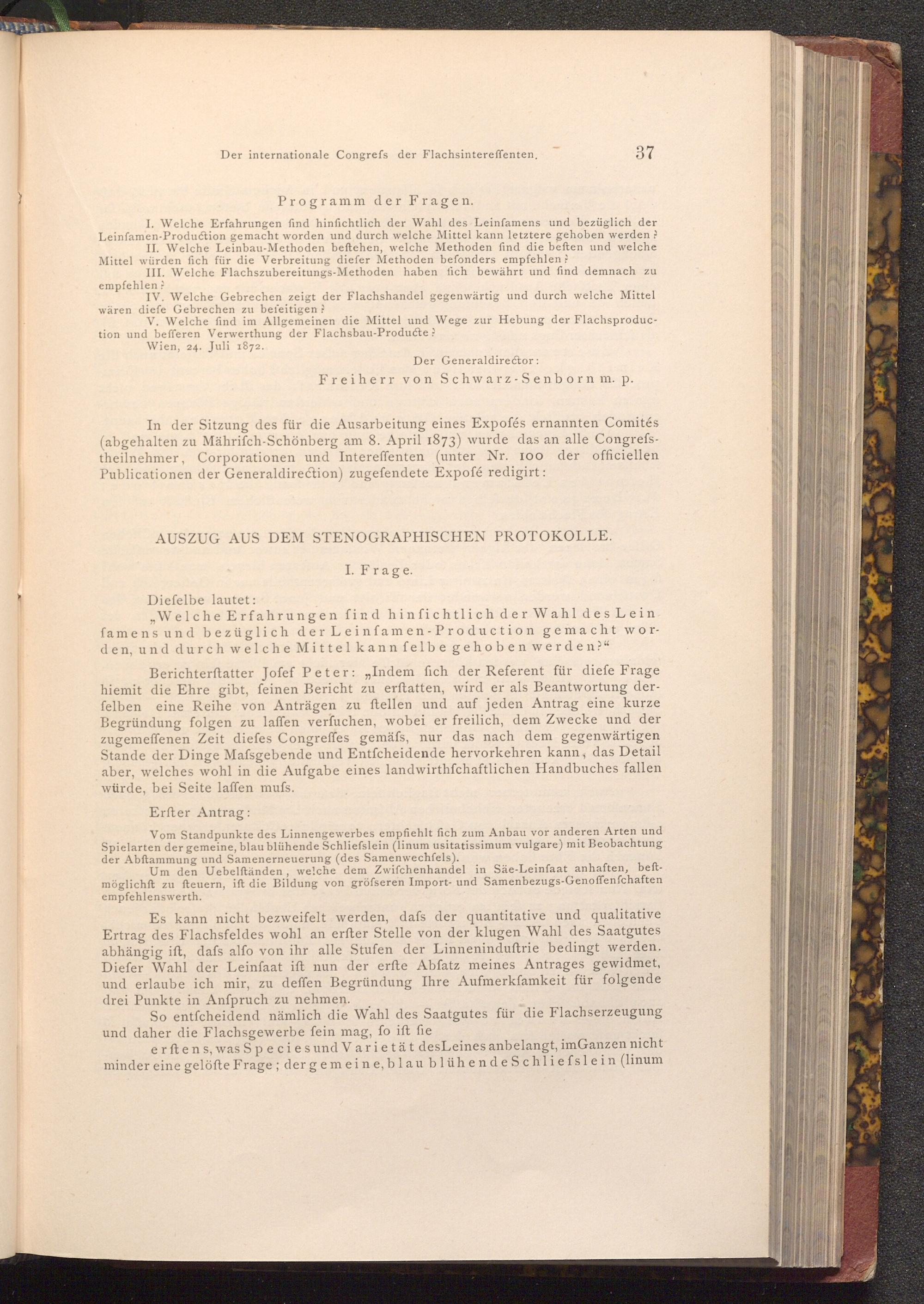 Es kann nicht bezweifelt werden, dafs der quantitative und qualitative Ertrag des Flachsfeldes wohl an erfter Stelle von der klugen Wahl des Saatgutes abhängig ift, dafs alfo von ihr alle Stufen der Linneninduftrie bedingt werden. Diefer Wahl der Leinfaat ift nun der erfte Abfatz meines Antrages gewidmet, und erlaube ich mir, zu deffen Begründung Ihre Aufmerkfamkeit für folgende drei Punkte in Anspruch zu nehmen.