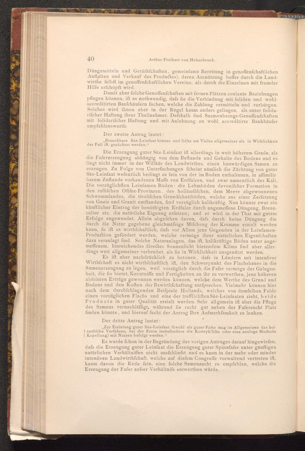 Es wurde fchon in der Begründung des vorigen Antrages darauf hingewiefen, dafs die Erzeugung guter Leinfaat die Erzeugung guter Spinnfafer unter günftigen natürlichen Verhältniffen nicht ausfchliefst und es kann in der mehr oder minder intenfiven Landwirthschaft, welche auf diefem Congreffe vorwaltend vertreten ift, kaum davon die Rede fein, eine folche Samenzucht zu empfehlen, welche die Erzeugung der Fafer aufser Verhältnifs entwerthen würde.