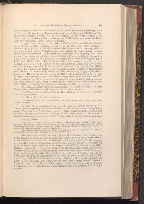 Hieraus ift zu entnehmen, dafs der Flachs, als zweite Frucht oder als Stoppelfrucht angebaut, felbftverſtändlich nie einen befonderen Ertrag liefern kann. Wenn wir der Anficht find, dafs der Flachs durch den frühen Anbau eine kräftige, haltbare Fafer erhält, fo liegt es nahe, dafs, wenn der Anbau erft im hohen Sommer vorgenommen wird, die Pflanze nicht befonders haltbar fein kann. Antrag 2 lautet: