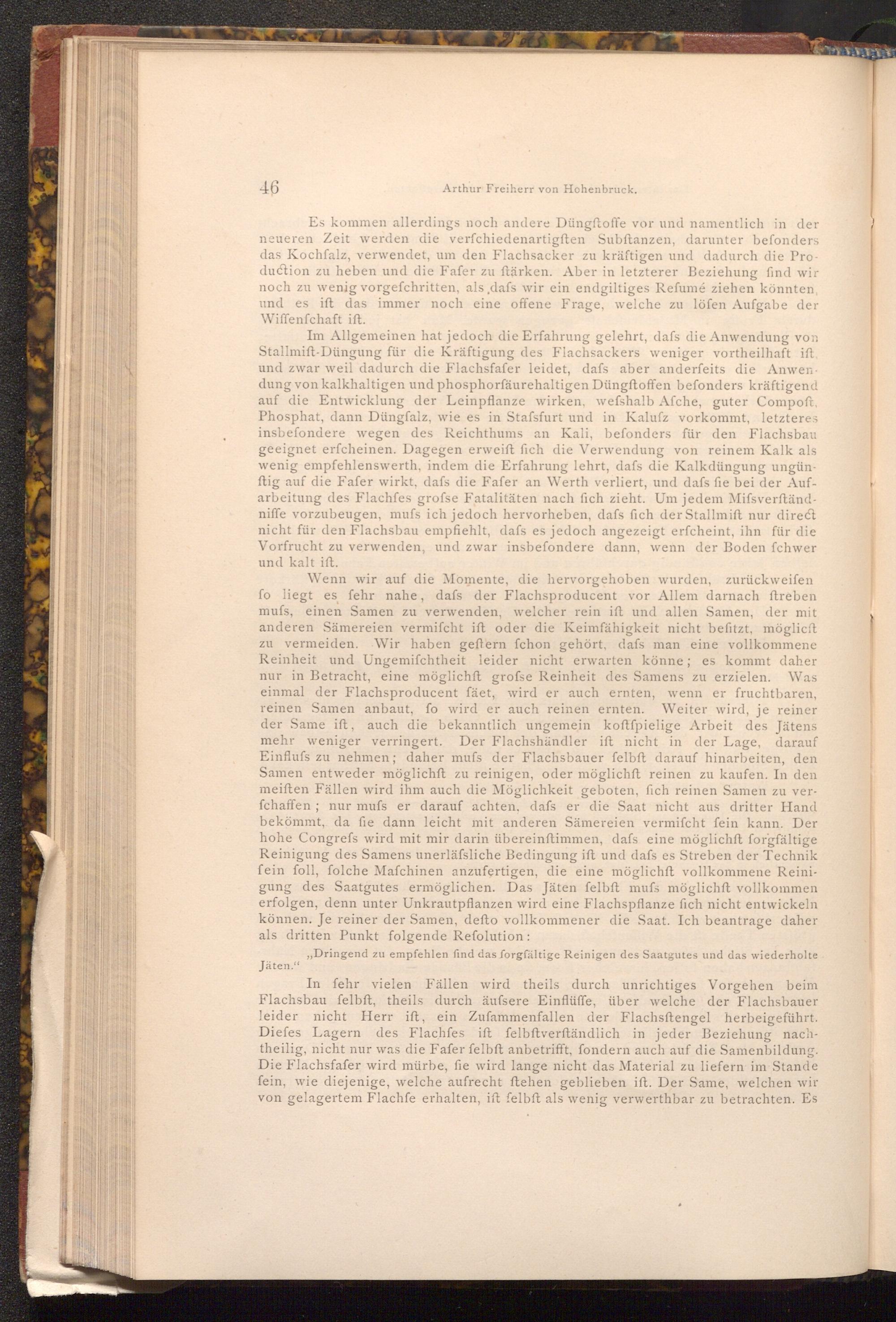 Wenn wir auf die Momente, die hervorgehoben wurden, zurückweifen fo liegt es fehr nahe, dafs der Flachsproducent vor Allem darnach ftreben mufs, einen Samen zu verwenden, welcher rein ift und allen Samen, der mit anderen Sämereien vermifcht ift oder die Keimfähigkeit nicht befitzt, möglicft zu vermeiden. Wir haben geftern fchon gehört, dafs man eine vollkommene Reinheit und Ungemifchtheit leider nicht erwarten könne; es kommt daher nur in Betracht, eine möglichft grofse Reinheit des Samens zu erzielen. Was einmal der Flachsproducent fäet, wird er auch ernten, wenn er fruchtbaren, reinen Samen anbaut, fo wird er auch reinen ernten. Weiter wird, je reiner der Same ift, auch die bekanntlich ungemein koftfpielige Arbeit des Jätens mehr weniger verringert. Der Flachshändler ift nicht in der Lage, darauf Einflufs zu nehmen; daher mufs der Flachsbauer felbft darauf hinarbeiten, den Samen entweder möglichft zu reinigen, oder möglichft reinen zu kaufen. In den meiften Fällen wird ihm auch die Möglichkeit geboten, fich reinen Samen zu verfchaffen; nur mufs er darauf achten, dafs er die Saat nicht aus dritter Hand bekömmt, da fie dann leicht mit anderen Sämereien vermifcht fein kann. Der hohe Congrefs wird mit mir darin übereinstimmen, dafs eine möglichft forgfältige Reinigung des Samens unerläfsliche Bedingung ift und dafs es Streben der Technik fein foll, folche Maſchinen anzufertigen, die eine möglichft vollkommene Reinigung des Saatgutes ermöglichen. Das Jäten felbft mufs möglichft vollkommen erfolgen, denn unter Unkrautpflanzen wird eine Flachspflanze fich nicht entwickeln können. Je reiner der Samen, defto vollkommener die Saat. Ich beantrage daher als dritten Punkt folgende Refolution: