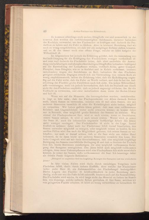 Es kommen allerdings noch andere Düngftoffe vor und namentlich in der neueren Zeit werden die verfchiedenartigften Subftanzen, darunter befonders das Kochfalz, verwendet, um den Flachsacker zu kräftigen und dadurch die Production zu heben und die Fafer zu ftärken. Aber in letzterer Beziehung find wir noch zu wenig vorgefchritten, als dafs wir ein endgiltiges Refumé ziehen könnten, und es ift das immer noch eine offene Frage, welche zu löfen Aufgabe der Wiffenfchaft ift.