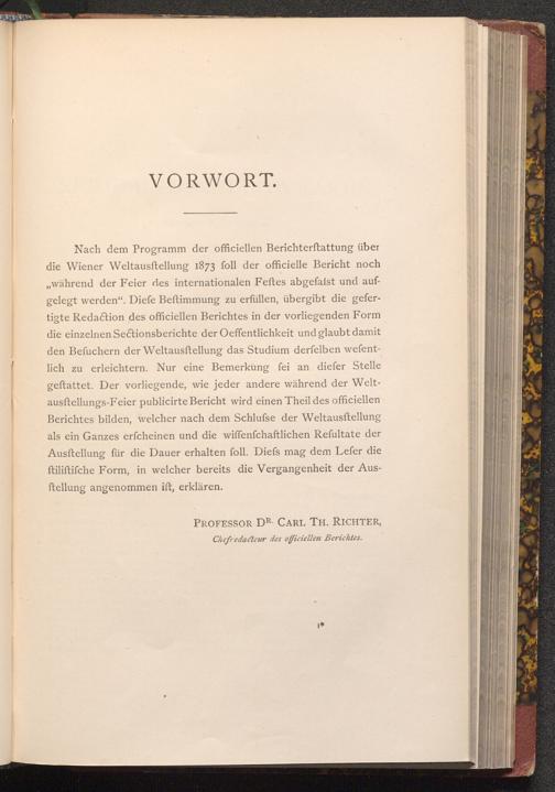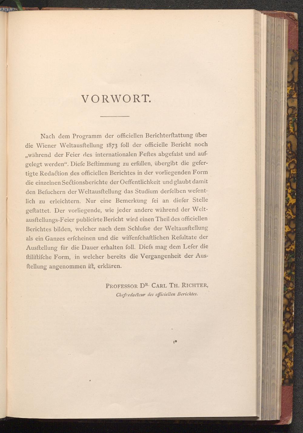 Nach dem Programm der officiellen Berichterstattung über die Wiener Weltausftellung 1873 foll der officielle Bericht noch während der Feier des internationalen Feftes abgefaist und aufgelegt werden". Diefe Beftimmung zu erfüllen, übergibt die gefertigte Redaction des officiellen Berichtes in der vorliegenden Form die einzelnen Sectionsberichte der Oeffentlichkeit und glaubt damit den Befuchern der Weltausftellung das Studium derfelben wefentlich zu erleichtern. Nur eine Bemerkung fei an diefer Stelle geftattet. Der vorliegende, wie jeder andere während der Weltausftellungs- Feier publicirte Bericht wird einen Theil des officiellen Berichtes bilden, welcher nach dem Schlufse der Weltausstellung als ein Ganzes erſcheinen und die wiffenfchaftlichen Refultate der Ausftellung für die Dauer erhalten foll. Diefs mag dem Lefer die ftiliftifche Form, in welcher bereits die Vergangenheit der Ausftellung angenommen ift, erklären.