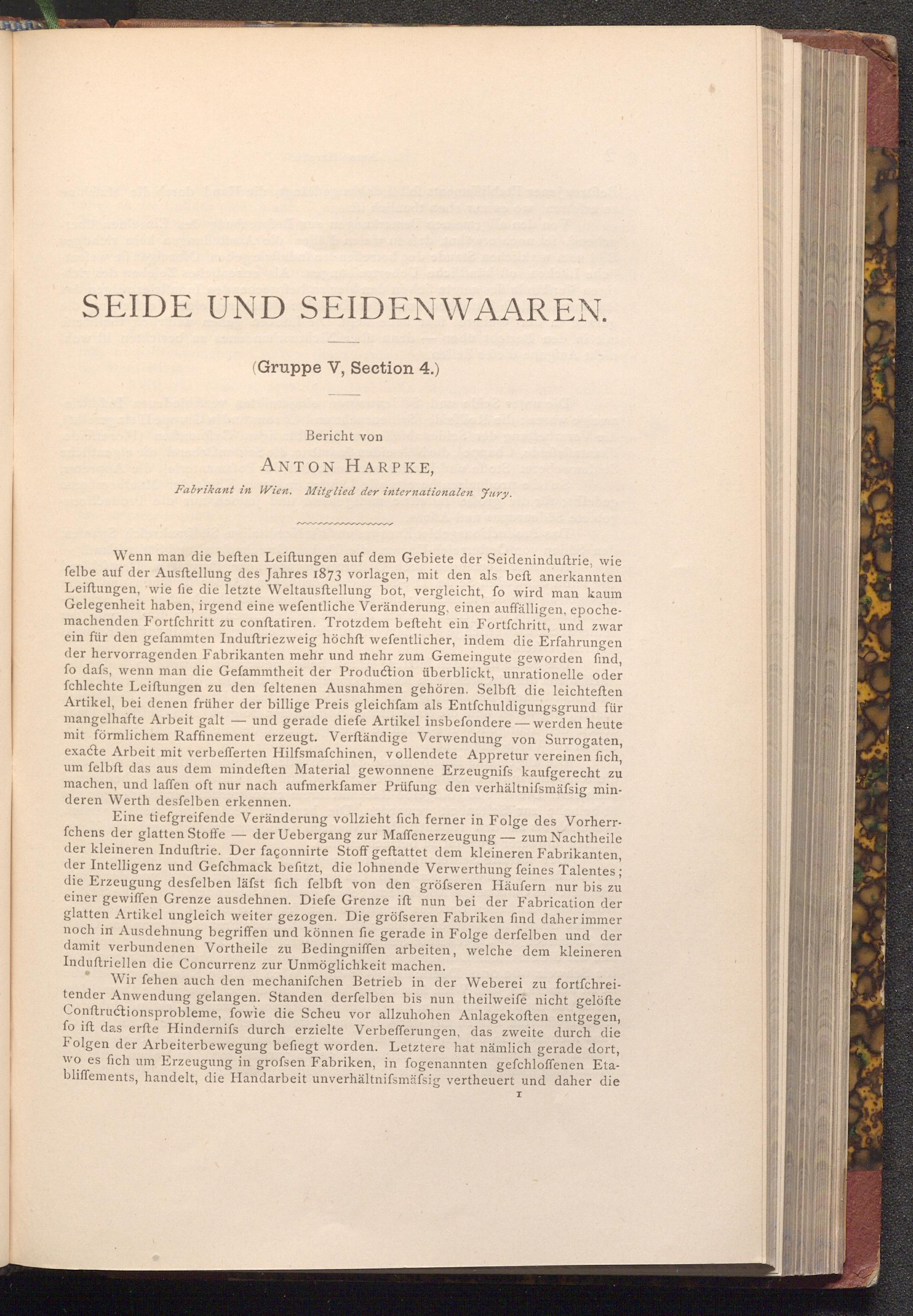 Wenn man die beften Leiftungen auf dem Gebiete der Seideninduftrie, wie felbe auf der Ausftellung des Jahres 1873 vorlagen, mit den als beft anerkannten Leiftungen, wie fie die letzte Weltausftellung bot, vergleicht, fo wird man kaum Gelegenheit haben, irgend eine wefentliche Veränderung, einen auffälligen, epochemachenden Fortfchritt zu conftatiren. Trotzdem befteht ein Fortfchritt, und zwar ein für den gefammten Induftriezweig höchft wefentlicher, indem die Erfahrungen der hervorragenden Fabrikanten mehr und mehr zum Gemeingute geworden find, fo dafs, wenn man die Gefammtheit der Production überblickt, unrationelle oder fchlechte Leiftungen zu den feltenen Ausnahmen gehören. Selbft die leichteften Artikel, bei denen früher der billige Preis gleichfam als Entfchuldigungsgrund für mangelhafte Arbeit galt und gerade diefe Artikel insbefondere- werden heute mit förmlichem Raffinement erzeugt. Verſtändige Verwendung von Surrogaten, exacte Arbeit mit verbefferten Hilfsmafchinen, vollendete Appretur vereinen fich, um felbft das aus dem mindeften Material gewonnene Erzeugnifs kaufgerecht zu machen, und laffen oft nur nach aufmerkfamer Prüfung den verhältnifsmässig minderen Werth desfelben erkennen.