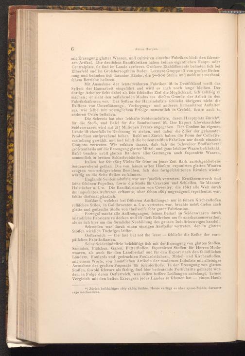 Die Schweiz hat eine lebhafte Seideninduftrie, deren Hauptplatz Zürich*) für die Stoff-, und Bafel für die Bandweberei ift. Der Export fchweizerifcher Seidenwaaren wird mit 215 Millionen Francs angegeben. Der Confum im eigenen Lande ift ebenfalls in Rechnung zu ziehen, und daher die Ziffer der gefammten Production entſprechend höher. Bafel und Zürich haben die Form der Collectivausftellung gewählt, und find felbft die bedeutendften Fabriken nur durch einzelne Coupons vertreten. Wir erfahen daraus, dafs fich die Schweizer Stoffweberei gröfstentheils auf die Erzeugung glatter Mittel- und ganz leichter Waare befchränkt. Bafel brachte nebft glatten Bändern aller Gattungen auch façonnirte Waaren, namentlich in breiten Schleifenbändern.