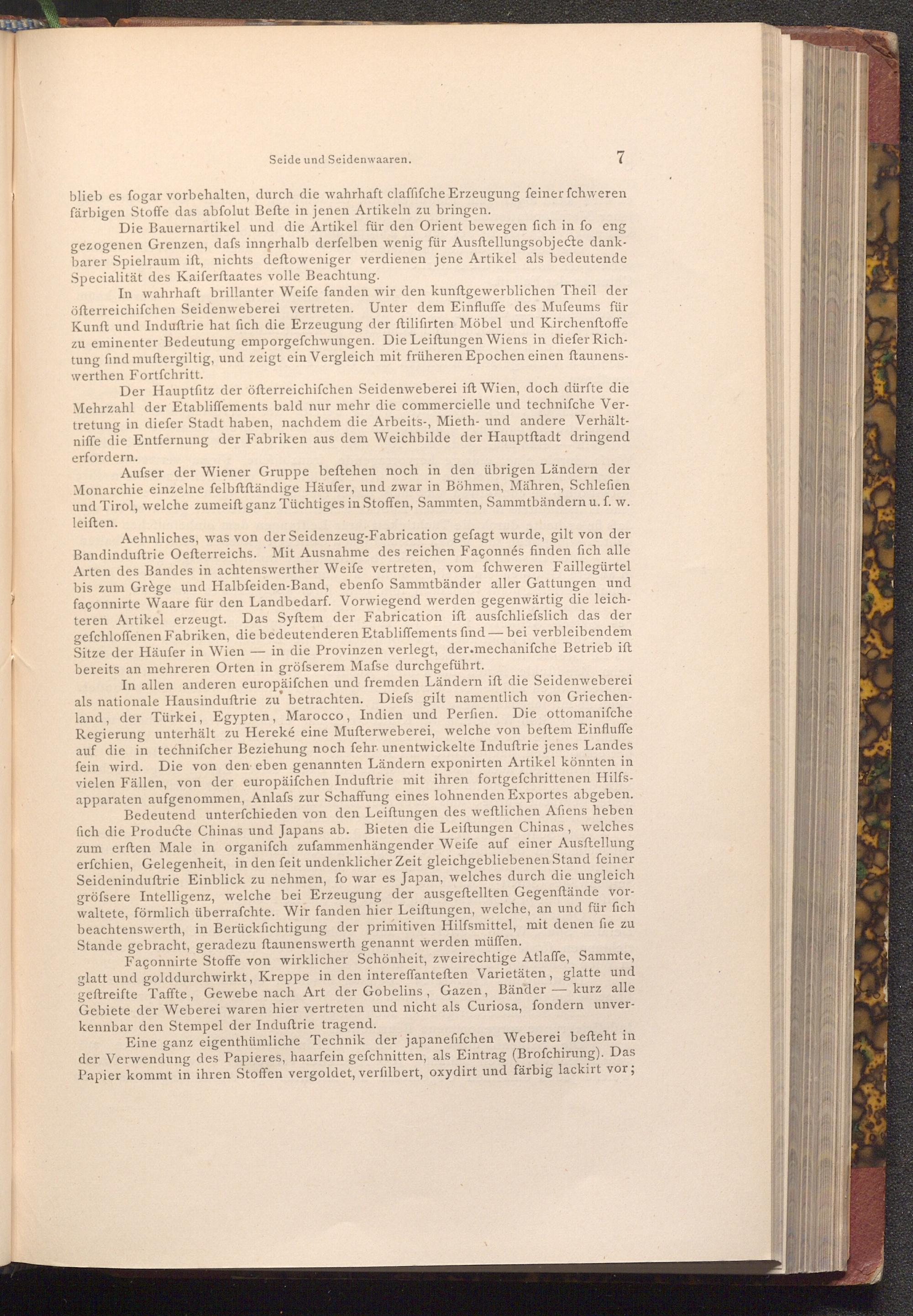 In allen anderen europäiſchen und fremden Ländern ift die Seidenweberei als nationale Hausinduftrie zu betrachten. Diefs gilt namentlich von Griechenland, der Türkei, Egypten, Marocco, Indien und Perfien. Die ottomanifche Regierung unterhält zu Hereké eine Mufterweberei, welche von beftem Einfluffe auf die in technifcher Beziehung noch fehr unentwickelte Induftrie jenes Landes fein wird. Die von den eben genannten Ländern exponirten Artikel könnten in vielen Fällen, von der europäiſchen Induftrie mit ihren fortgefchrittenen Hilfsapparaten aufgenommen, Anlafs zur Schaffung eines lohnenden Exportes abgeben.