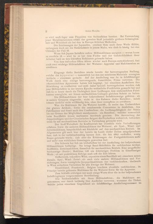 Oefterreich, refpective Wien, exponirte einen Bandftuhl mit einzelnen neuen Details, Spul-, Wind-, Zettel-, als auch viele andere Hilfsmafchinen und Vorrichtungen, fowie vorzügliche Jacquardmafchinen der verfchiedenften, theilweife in Wien erdachten Varietäten für alle Zweige der Weberei.