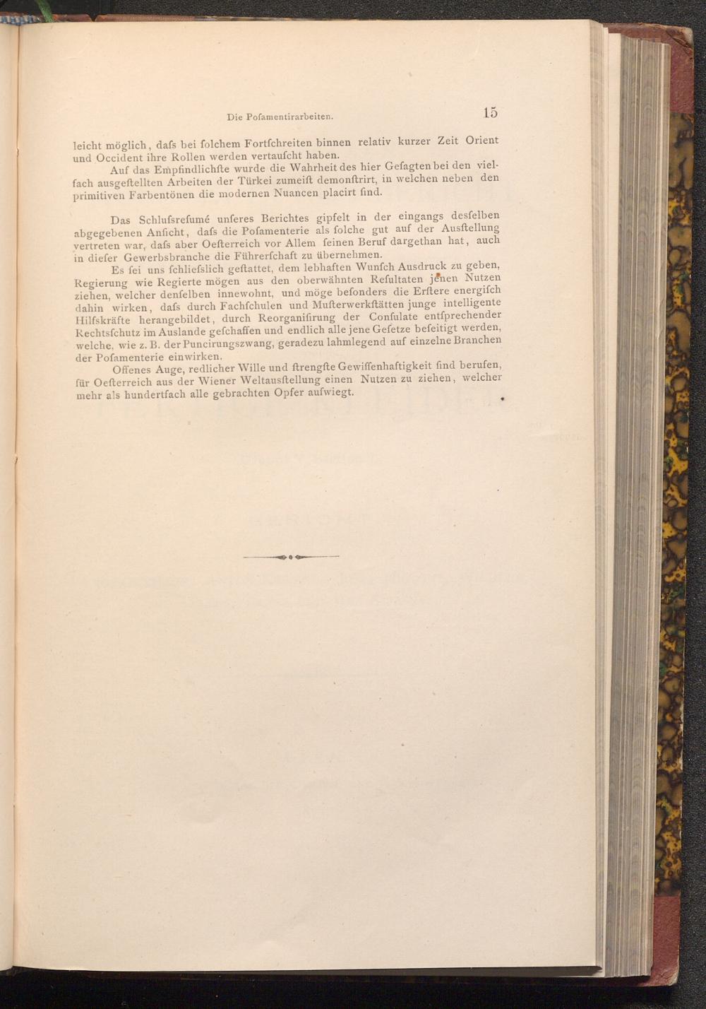 Es fei uns fchliesslich geftattet, dem lebhaften Wunfch Ausdruck zu geben, Regierung wie Regierte mögen aus den oberwähnten Refultaten jenen Nutzen ziehen, welcher denfelben innewohnt, und möge befonders die Erftere energifch dahin wirken, dafs durch Fachſchulen und Mufterwerkftätten junge intelligente Hilfskräfte herangebildet, durch Reorganifirung der Confulate entſprechender Rechtsfchutz im Auslande gefchaffen und endlich alle jene Gefetze befeitigt werden, welche, wie z. B. der Puncirungszwang, geradezu lahmlegend auf einzelne Branchen der Pofamenterie einwirken.