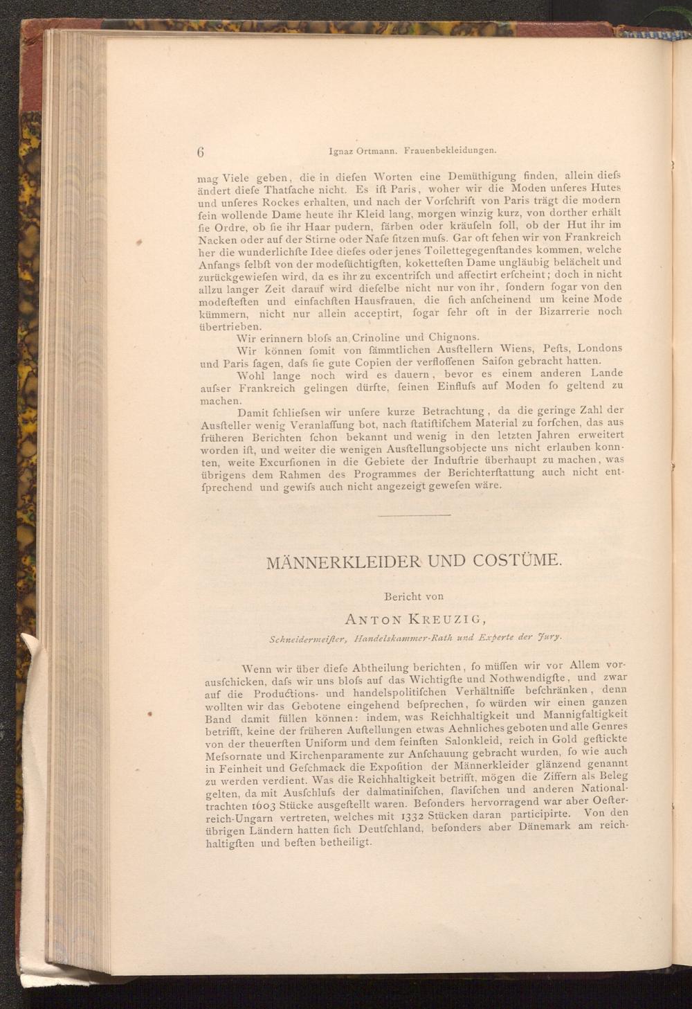 Wenn wir über diefe Abtheilung berichten, fo müffen wir vor Allem vorausfchicken, dafs wir uns blofs auf das Wichtigfte und Nothwendigfte, und zwar auf die Productions- und handelspolitifchen Verhältniffe befchränken, denn wollten wir das Gebotene eingehend befprechen, fo würden wir einen ganzen Band damit füllen können: indem, was Reichhaltigkeit und Mannigfaltigkeit betrifft, keine der früheren Auftellungen etwas Aehnliches geboten und alle Genres von der theuerften Uniform und dem feinften Salonkleid, reich in Gold geftickte Mefsornate und Kirchenparamente zur Anfchauung gebracht wurden, fo wie auch in Feinheit und Gefchmack die Expofition der Männerkleider glänzend genannt zu werden verdient. Was die Reichhaltigkeit betrifft, mögen die Ziffern als Beleg gelten, da mit Ausfchlufs der dalmatinifchen, flavifchen und anderen Nationaltrachten 1603 Stücke ausgeftellt waren. Befonders hervorragend war aber Oefterreich- Ungarn vertreten, welches mit 1332 Stücken daran participirte. Von den übrigen Ländern hatten fich Deutfchland, befonders aber Dänemark am reichhaltigften und beften betheiligt.