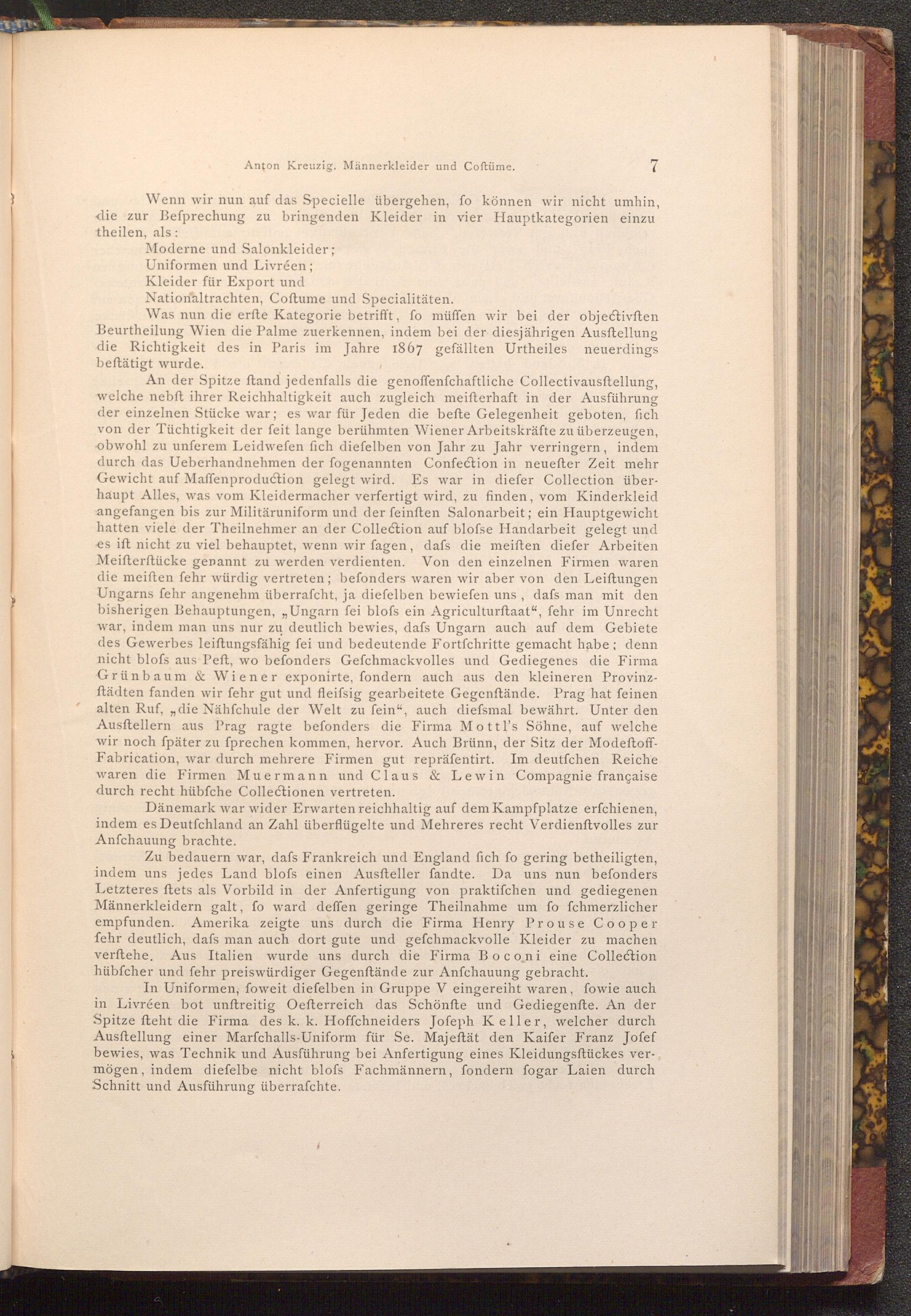 In Uniformen, foweit diefelben in Gruppe V eingereiht waren, fowie auch in Livréen bot unftreitig Oefterreich das Schönfte und Gediegenfte. An der Spitze fteht die Firma des k. k. Hoffchneiders Jofeph Keller, welcher durch Ausftellung einer Marfchalls- Uniform für Se. Majeftät den Kaifer Franz Jofef bewies, was Technik und Ausführung bei Anfertigung eines Kleidungsstückes vermögen, indem diefelbe nicht blofs Fachmännern, fondern fogar Laien durch Schnitt und Ausführung überraschte.