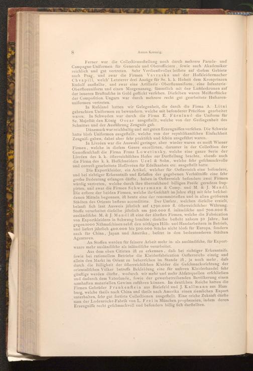 Die Exportkleider, ein Artikel, welcher für Oefterreich eine befondere, und bei richtiger Erkenntnifs und Erfaffen der gegebenen Verhältniffe eine fehr grofse Bedeutung erlangen dürfte, haben in Oefterreich befonders zwei Firmen würdig vertreten, welche durch ihre überrafchend billigen Preife geradezu frappirten, und zwar die Firmen Schwarzmann& Comp. und M.& J. Mandl. Die erftere der beiden Firmen, welche ihr Gefchäft im Jahre 1855 mit fehr befcheidenen Mitteln begonnen, ift heute eine der renommirteften und in allen gröfseren Städten des Orients beftens accreditirte. Der Umfatz, welchen diefelbe erzielt, belauft fich laut Ausweis jährlich auf 1,790.000 fl. öfterreichiſcher Währung. Stoffe verarbeitet diefelbe jährlich um 500.000 fl. inländifche und 700.000 fl. ausländifche. M.& J. Mandl ift eine der älteften Firmen, welche die Fabrication von Exportkleidern in Schwung brachte; diefelbe beſteht nahezu 50 Jahre, hat gegen 1000 Nähmaschinen nebft den nöthigen Hilfs- und Handarbeitern in Betrieb, und liefert jährlich 400.000 bis 500.000 Stücke nicht blofs für Europa, fondern auch für China, Japan und Amerika, befitzt in den bedeutenderen Städten Agenturen.