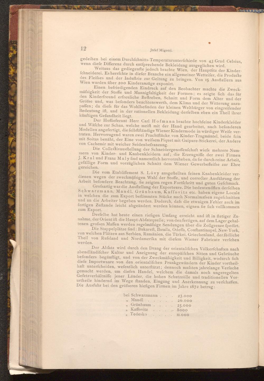Der Abfatz wird durch den Drang der orientalifchen Völkerfchaften nach abendländifcher Kultur und Aneignung der europäifchen Sitten und Gebräuche befonders begünftigt, und von der Zweckmäfsigkeit und Billigkeit, wodurch fich diefe Importwaare von den orientalifchen Prunkgewändern der Kinder vortheilhaft unterfcheiden, wefentlich unterſtützt; dennoch mufsten jahrelange Verfuche gemacht werden, um diefen Handel, welchem die damals noch ungeregelten Gefetzverhältniffe jener Länder, die hohen Schutzzölle und traditionellen Vorurtheile hindernd im Wege ftanden, Eingang und Anerkennung zu verfchaffen. Die Ausfuhr bei den gröfseren hiefigen Firmen im Jahre 1872 betrug: