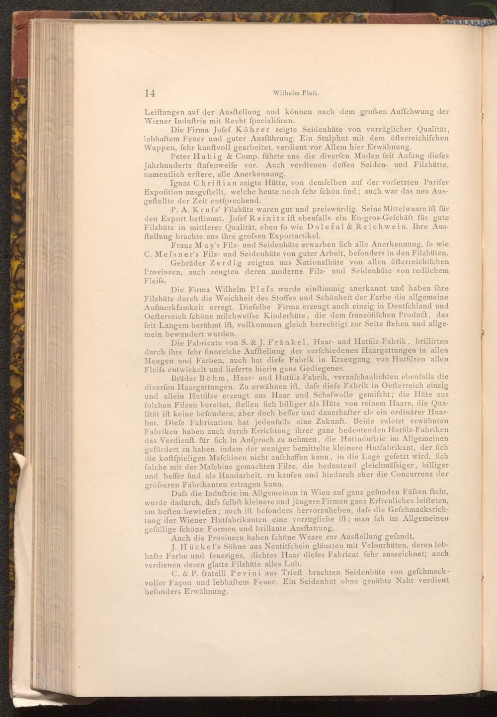 Die Firma Wilhelm Plefs wurde einftimmig anerkannt und haben ihre Filzhüte durch die Weichheit des Stoffes und Schönheit der Farbe die allgemeine Aufmerkfamkeit erregt. Diefelbe Firma erzeugt auch einzig in Deutſchland und Oefterreich fchöne milchweifse Kinderhüte, die dem franzöfifchen Product, das feit Langem berühmt ift, vollkommen gleich berechtigt zur Seite ftehen und allgemein bewundert wurden.
