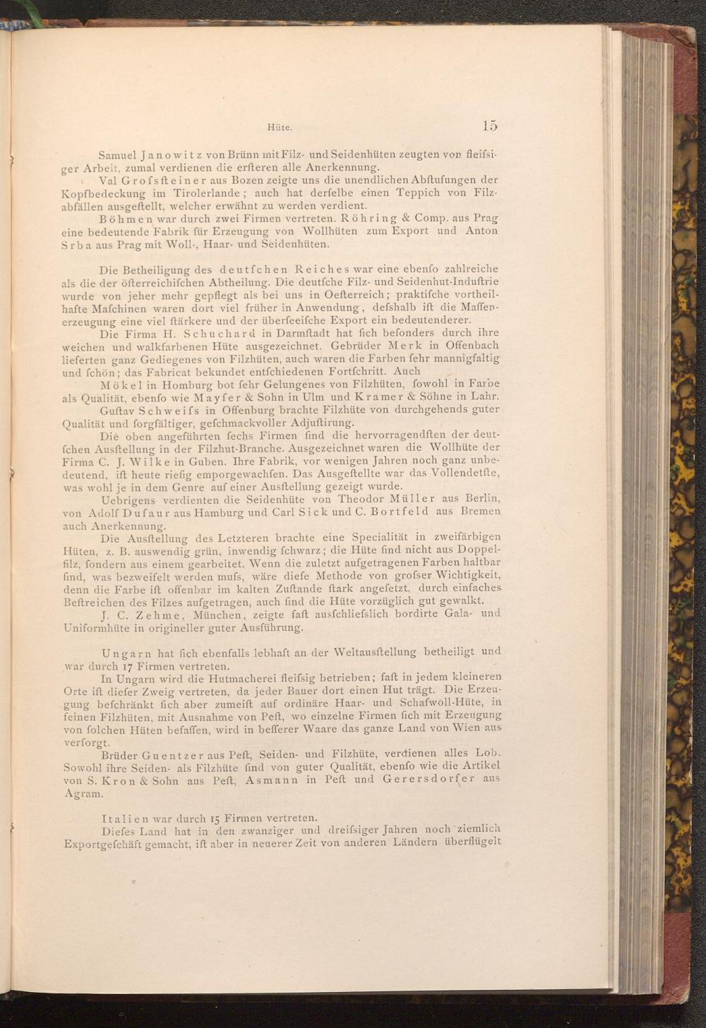 Die Betheiligung des deutfchen Reiches war eine ebenfo zahlreiche als die der öfterreichifchen Abtheilung. Die deutfche Filz- und Seidenhut- Induftrie wurde von jeher mehr gepflegt als bei uns in Oefterreich; praktifche vortheilhafte Mafchinen waren dort viel früher in Anwendung, defshalb ift die Maffenerzeugung eine viel ftärkere und der überfeeifche Export ein bedeutenderer.