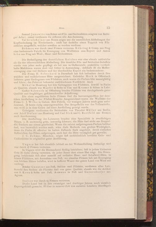 Böhmen war durch zwei Firmen vertreten. Röhring& Comp. aus Prag eine bedeutende Fabrik für Erzeugung von Wollhüten zum Export und Anton Srba aus Prag mit Woll-, Haar- und Seidenhüten.