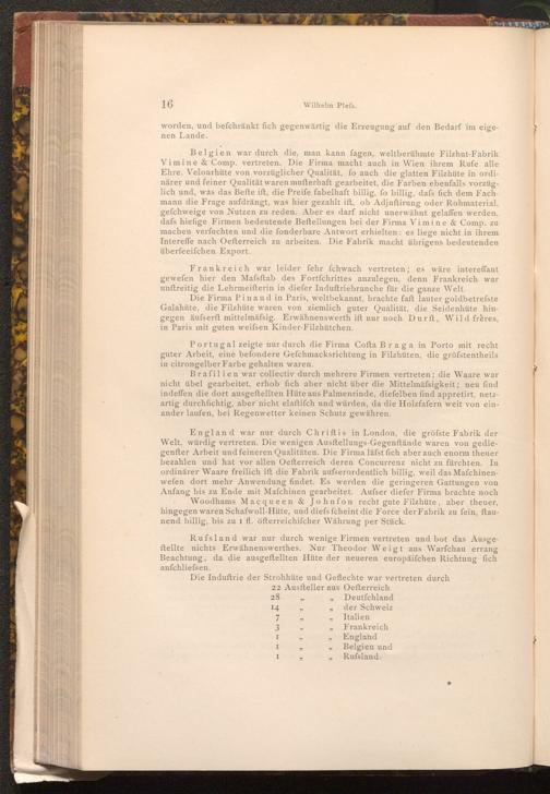 Belgien war durch die, man kann fagen, weltberühmte Filzhut- Fabrik Vimine& Comp. vertreten. Die Firma macht auch in Wien ihrem Rufe alle Ehre. Velourhüte von vorzüglicher Qualität, fo auch die glatten Filzhüte in ordinärer und feiner Qualität waren mufterhaft gearbeitet, die Farben ebenfalls vorzüglich und, was das Befte ift, die Preife fabelhaft billig, fo billig, dafs fich dem Fachmann die Frage aufdrängt, was hier gezahlt ift, ob Adjuftirung oder Rohmaterial, gefchweige von Nutzen zu reden. Aber es darf nicht unerwähnt gelaffen werden, dafs hiefige Firmen bedeutende Beftellungen bei der Firma Vimine& Comp. zu machen verfuchten und die fonderbare Antwort erhielten: es liege nicht in ihrem Intereffe nach Oefterreich zu arbeiten. Die Fabrik macht übrigens bedeutenden überfeeifchen Export.