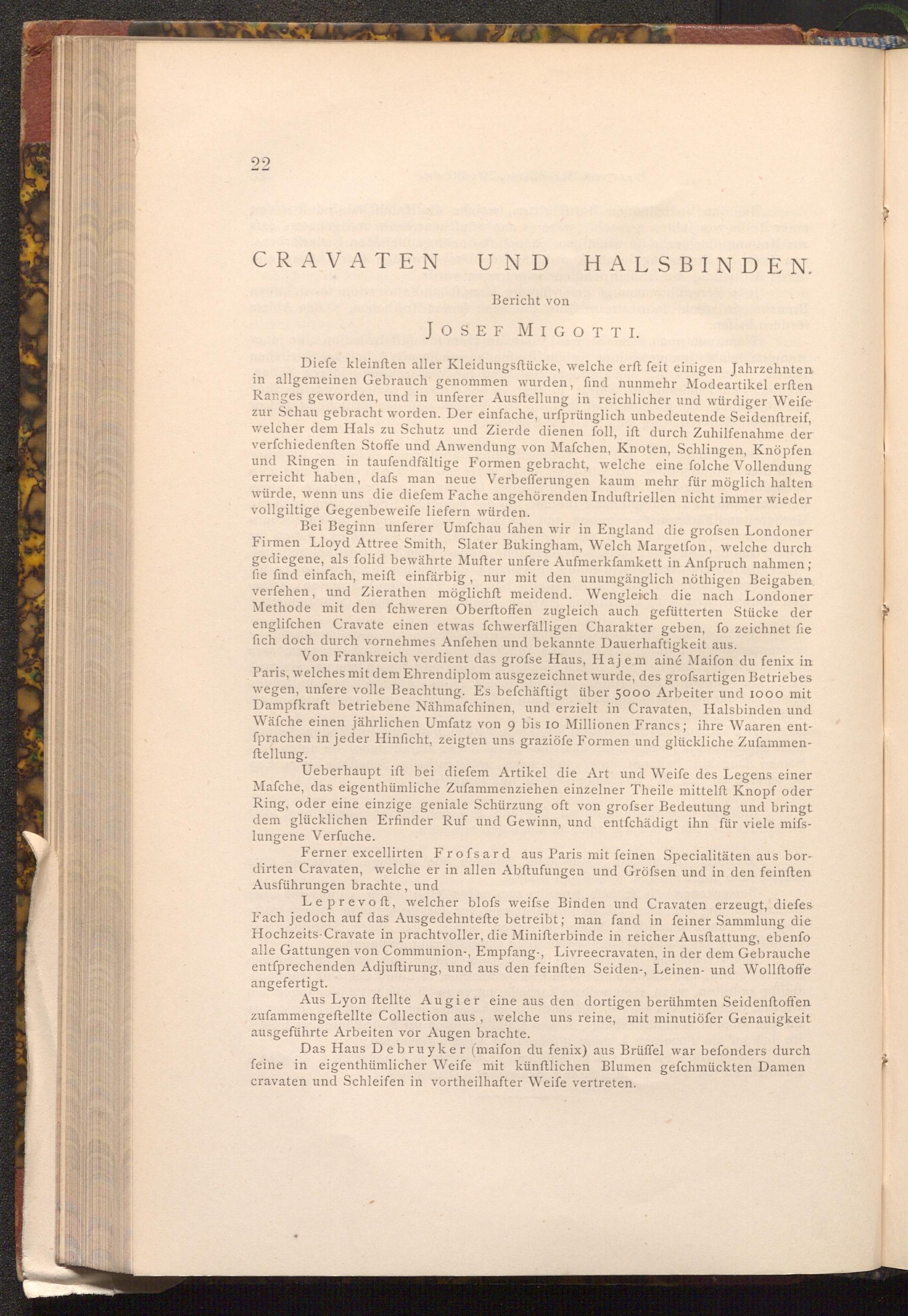 Diefe kleinften aller Kleidungsstücke, welche erft feit einigen Jahrzehnten in allgemeinen Gebrauch genommen wurden, find nunmehr Modeartikel erften Ranges geworden, und in unferer Ausftellung in reichlicher und würdiger Weife zur Schau gebracht worden. Der einfache, urfprünglich unbedeutende Seidenftreif, welcher dem Hals zu Schutz und Zierde dienen foll, ift durch Zuhilfenahme der verfchiedenften Stoffe und Anwendung von Mafchen, Knoten, Schlingen, Knöpfen und Ringen in taufendfältige Formen gebracht, welche eine folche Vollendung erreicht haben, dafs man neue Verbefferungen kaum mehr für möglich halten würde, wenn uns die diefem Fache angehörenden Induftriellen nicht immer wieder vollgiltige Gegenbeweife liefern würden.