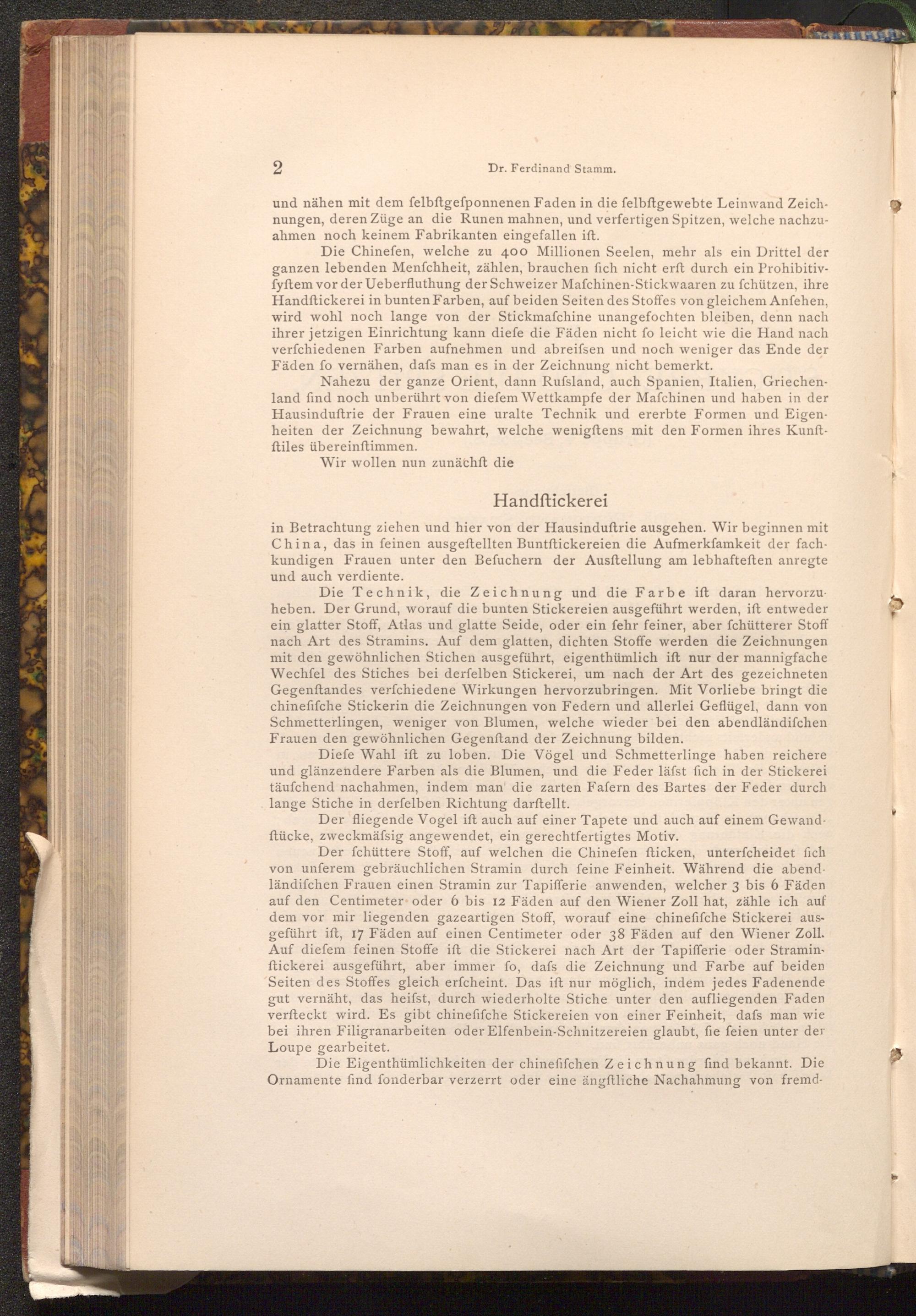 Die Chinefen, welche zu 400 Millionen Seelen, mehr als ein Drittel der ganzen lebenden Menfchheit, zählen, brauchen fich nicht erft durch ein Prohibitivfyftem vor der Ueberfluthung der Schweizer Mafchinen- Stickwaaren zu fchützen, ihre Handftickerei in bunten Farben, auf beiden Seiten des Stoffes von gleichem Anfehen, wird wohl noch lange von der Stickmafchine unangefochten bleiben, denn nach ihrer jetzigen Einrichtung kann diefe die Fäden nicht fo leicht wie die Hand nach verfchiedenen Farben aufnehmen und abreifsen und noch weniger das Ende der Fäden fo vernähen, dafs man es in der Zeichnung nicht bemerkt.
