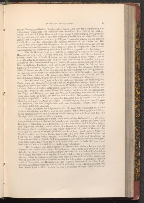 Durch die Engländer wurden denn auch auf der Weltausftellung 1873 fehr fchöne Stickereien aus Indien herbeigebracht, darunter kunftvolle Shawls und Gewänder, befonders in Goldftickerei. Als die koftbarften und fchönften mögen jene angefehen werden, wo das Gold den Grund der Stickerei bildet, und die Zeichnung durch verfchiedenfarbige Seide ausgeführt ift, wie das Gewand, das die Figur des Nabob in feinem gefchmückten Zelte trug. Auch andere Arten von Buntftickereien waren aus Indien ausgeftellt, die von dem hohen Stande der Stickerei bei einem Volke zeugen, das an Kunftfertigkeit und Kunftfinn, an Phantafie und feinem Gefühle für Farbenharmonie den meiften anderen vorangeht, aber diefe Ausftellung ftand jenen in London 1862 und in Paris 1867 nach, und liefs eher auf einen Rückfchritt als Auffchwung fchliefsen.