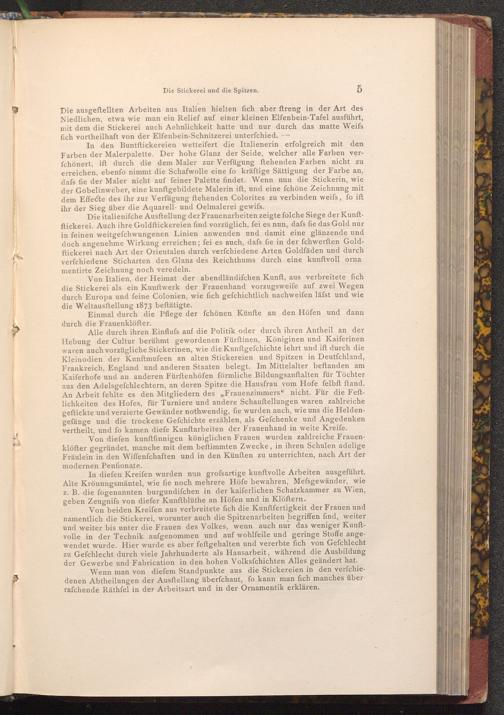 Von Italien, der Heimat der abendländifchen Kunft, aus verbreitete fich die Stickerei als ein Kunftwerk der Frauenhand vorzugsweife auf zwei Wegen durch Europa und feine Colonien, wie fich gefchichtlich nachweifen läfst und wie die Weltausftellung 1873 beſtätigte.