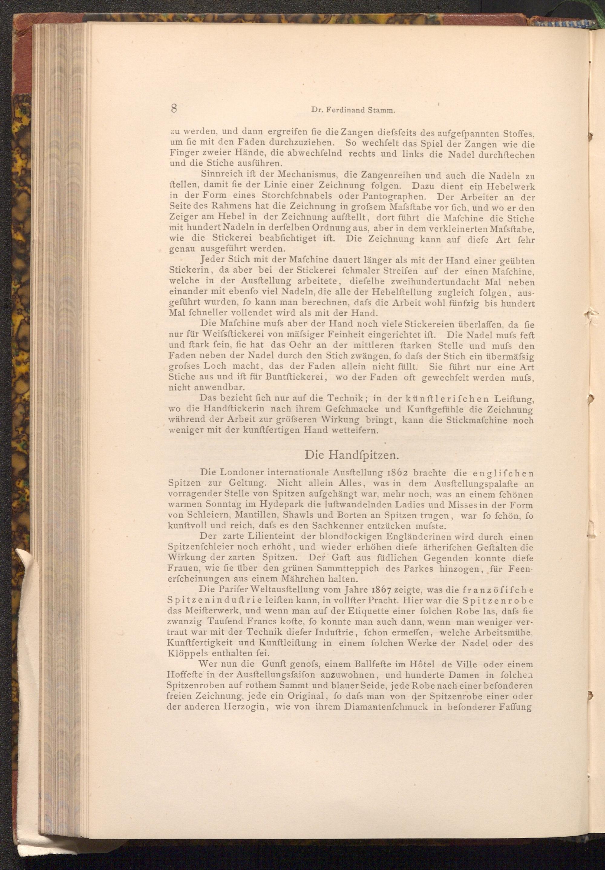 Die Parifer Weltausftellung vom Jahre 1867 zeigte, was die franzöfifche Spitzeninduftrie leiften kann, in vollfter Pracht. Hier war die Spitzenrobe das Meisterwerk, und wenn man auf der Etiquette einer folchen Robe las, dafs fie zwanzig Taufend Francs kofte, fo konnte man auch dann, wenn man weniger vertraut war mit der Technik diefer Induſtrie, fchon ermeffen, welche Arbeitsmühe, Kunftfertigkeit und Kunftleiftung in einem folchen Werke der Nadel oder des Klöppels enthalten fei.