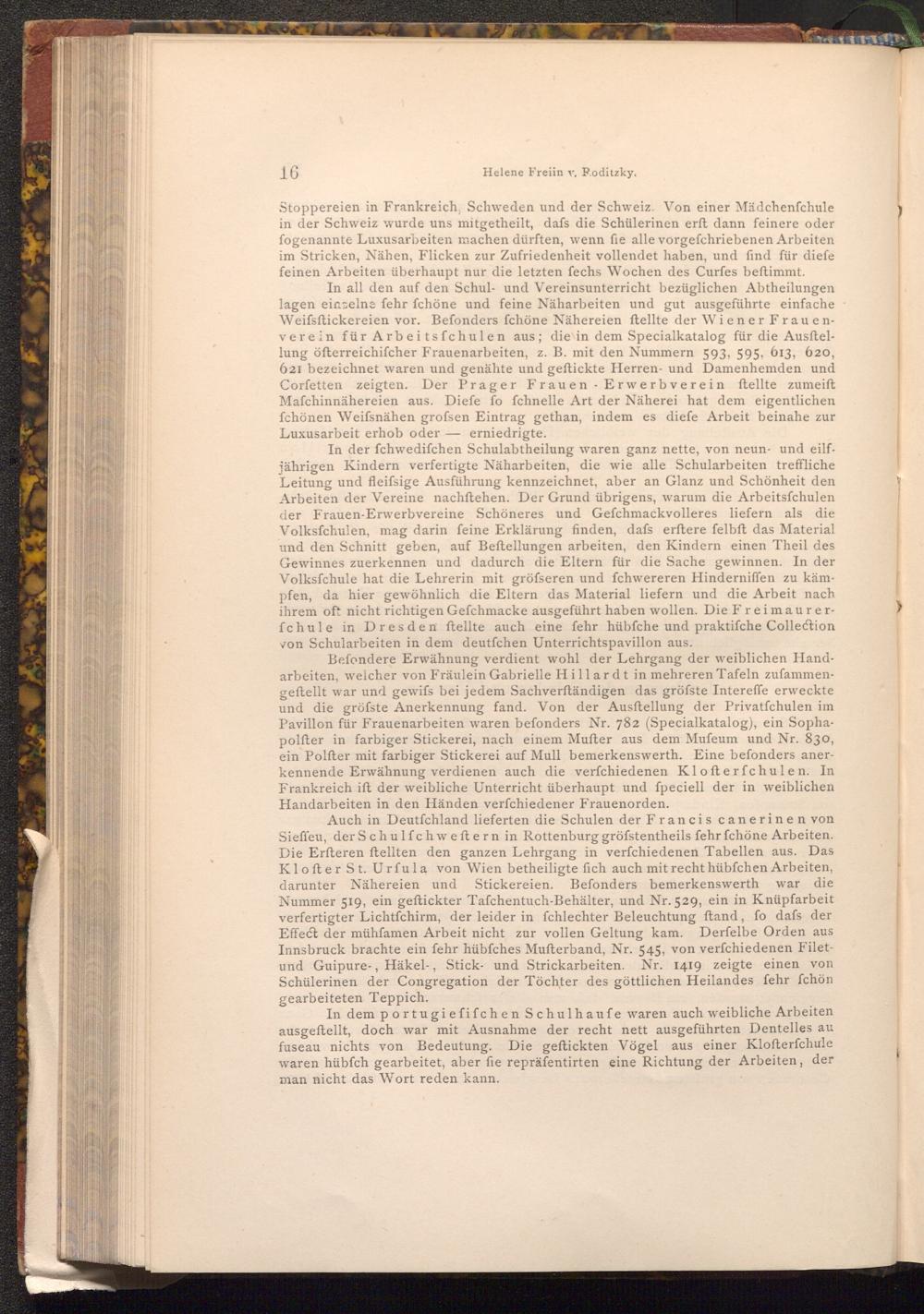 Befondere Erwähnung verdient wohl der Lehrgang der weiblichen Handarbeiten, welcher von Fräulein Gabrielle Hillardt in mehreren Tafeln zufammengeftellt war und gewifs bei jedem Sachverständigen das gröfste Intereffe erweckte und die gröfste Anerkennung fand. Von der Ausftellung der Privatfchulen im Pavillon für Frauenarbeiten waren befonders Nr. 782( Specialkatalog), ein Sophapolfter in farbiger Stickerei, nach einem Mufter aus dem Mufeum und Nr. 830, ein Polfter mit farbiger Stickerei auf Mull bemerkenswerth. Eine befonders anerkennende Erwähnung verdienen auch die verfchiedenen Klofterfchulen. In Frankreich ift der weibliche Unterricht überhaupt und ſpeciell der in weiblichen Handarbeiten in den Händen verfchiedener Frauenorden.
