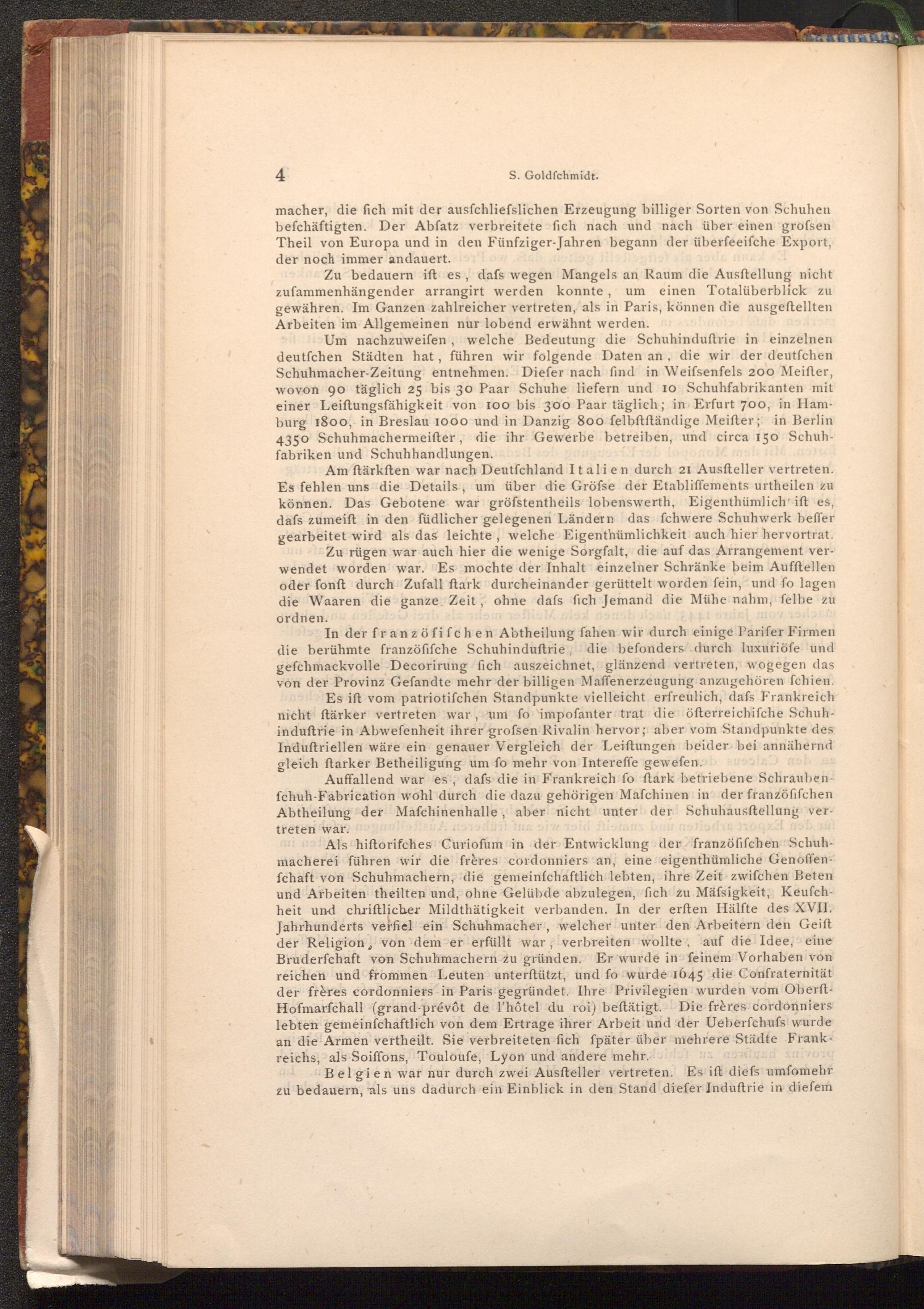 In der franzöfifchen Abtheilung fahen wir durch einige Parifer Firmen die berühmte franzöfifche Schuhinduftrie, die befonders durch luxuriöfe und gefchmackvolle Decorirung fich auszeichnet, glänzend vertreten, wogegen das von der Provinz Gefandte mehr der billigen Maffenerzeugung anzugehören fchien. Es ist vom patriotifchen Standpunkte vielleicht erfreulich, dafs Frankreich nicht ftärker vertreten war, um fo impofanter trat die öfterreichifche Schuhinduftrie in Abwefenheit ihrer grofsen Rivalin hervor; aber vom Standpunkte des Induftriellen wäre ein genauer Vergleich der Leiftungen beider bei annähernd gleich ftarker Betheiligung um fo mehr von Intereffe gewefen.b ausole mob as Auffallend war es, dafs die in Frankreich fo ftark betriebene Schraubenfchuh- Fabrication wohl durch die dazu gehörigen Mafchinen in der franzöfifchen Abtheilung der Mafchinenhalle, aber nicht unter der Schuhausftellung vertreten war. gullfandi tu si sid Aismus bau astisdan oq bun mis Als hiftorifches Curiofum in der Entwicklung der franzöfifchen Schuhmacherei führen wir die frères cordonniers an, eine eigenthümliche Genoffenfchaft von Schuhmachern, die gemeinfchaftlich lebten, ihre Zeit zwifchen Beten und Arbeiten theilten und, ohne Gelübde abzulegen, fich zu Mäfsigkeit, Keufchheit und chriftlicher Mildthätigkeit verbanden. In der erften Hälfte des XVII. Jahrhunderts verfiel ein Schuhmacher, welcher unter den Arbeitern den Geift der Religion, von dem er erfüllt war, verbreiten wollte, auf die Idee, eine Bruderfchaft von Schuhmachern zu gründen. Er wurde in feinem Vorhaben von reichen und frommen Leuten unterſtützt, und fo wurde 1645 die Confraternität der frères cordonniers in Paris gegründet. Ihre Privilegien wurden vom OberftHofmarfchall( grand- prévôt de l'hôtel du roi) beftätigt. Die frères cordonniers lebten gemeinfchaftlich von dem Ertrage ihrer Arbeit und der Ueberfchufs wurde an die Armen vertheilt. Sie verbreiteten fich später über mehrere Städte Frank reichs, als Soiffons, Touloufe, Lyon und andere mehr.oids us onlund saivonq Belgien war nur durch zwei Ausfteller vertreten. Es ift diefs umfomehr zu bedauern, als uns dadurch ein Einblick in den Stand diefer Induftrie in diefem