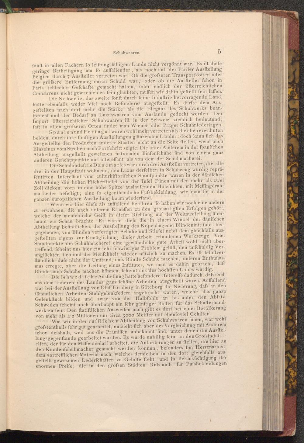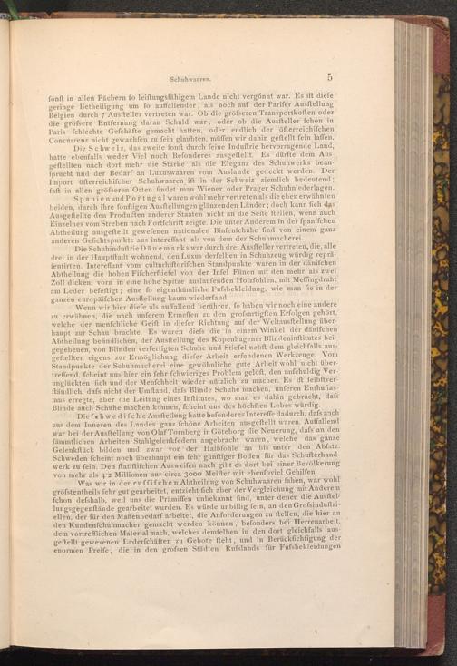 Was wir in der ruffifchen Abtheilung von Schuhwaaren fahen, war wohl gröfstentheils fehr gut gearbeitet, entzieht fich aber der Vergleichung mit Anderem fchon defshalb, weil uns die Prämiffen unbekannt find, unter denen die Ausftellungsgegenstände gearbeitet wurden. Es würde unbillig fein, an den Grofsinduftriellen, der für den Maffenbedarf arbeitet, die Anforderungen zu ftellen, die hier an den Kundenfchuhmacher gemacht werden können, befonders bei Herrenarbeit, dem vortrefflichen Material nach, welches demfelben in den dort gleichfalls ausgeftellt gewesenen Lederfchäften zu Gebote fteht, und in Berücksichtigung der enormen Preife, die in den grofsen Städten Rufslands für Fufsbekleidungen