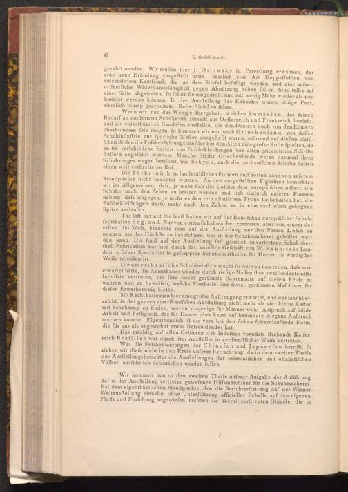 Wenn wir nun das Wenige übergehen, welches Rumänien, das feinen Bedarf an modernem Schuhwerk zumeift aus Oefterreich und Frankreich bezieht, und als volksthümlich Sandalen ausftellte, die den Daciern noch von den Römern überkommen fein mögen, fo kommen wir nun nach Griechenland, von deffen Schuhinduftrie nur fpärliche Mufter ausgeftellt waren, während auf diefem claffifchen Boden die Fufsbekleidungskünftler bei den Alten eine grofse Rolle spielten, da an 60 verfchiedene Sorten von Fufsbekleidungen von alten griechifchen Schriftftellern angeführt werden. Manche Städte Griechenlands waren dazumal ihres Schuhzeuges wegen berühmt, wie Sikyon, auch die tyrrhenifchen Schuhe hatten. einen weit verbreiteten Ruf.