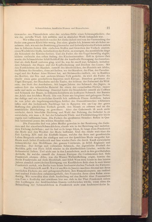 Nur Fräulein H. und E. Natté aus Rio de Janeiro machten diesmal mit ihren herrlichen Fächern aus zart gebogenen Federn, ihre Blumenbouquets, aus taufend und taufend Federchen zufammengeftellt, den Franzofen ihren alten Ruhm etwas ftreitig. Wir verweifen über diefe Ausftellung auf den Bericht über Frauenarbeit von Frau v. Roditzky und erwähnen hier nur, dafs in der That Frankreich neben den Leiftungen der brafilianifchen Damen verfchwinden würde, wenn eben die Behandlung der Schmuckfedern in Frankreich nicht eine hochentwickelte In