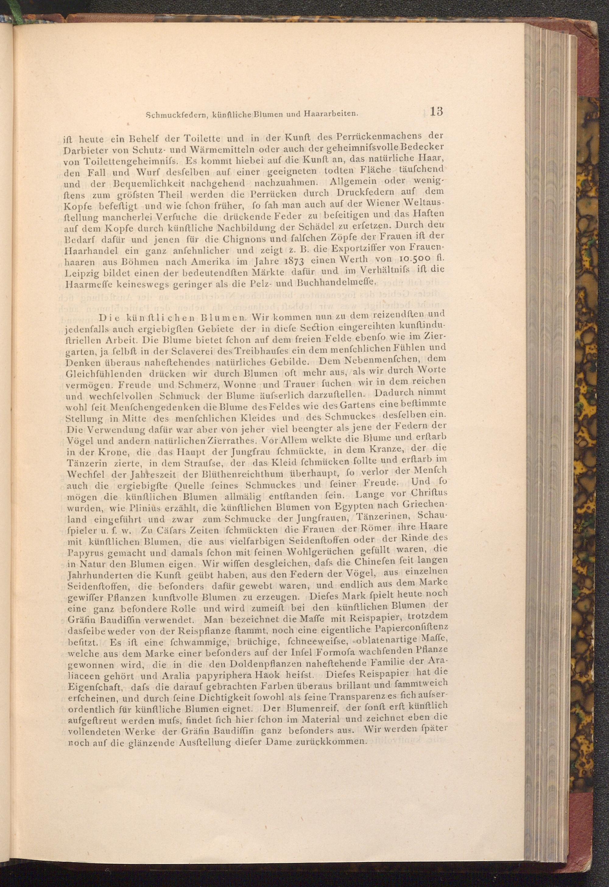 ift heute ein Behelf der Toilette und in der Kunft des Perrückenmachens der Darbieter von Schutz- und Wärmemitteln oder auch der geheimnifsvolle Bedecker von Toilettengeheimnifs. Es kommt hiebei auf die Kunft an, das natürliche Haar, den Fall und Wurf desfelben auf einer geeigneten todten Fläche täufchend und der Bequemlichkeit nachgehend nachzuahmen. Allgemein oder wenig. ftens zum gröfsten Theil werden die Perrücken durch Druckfedern auf dem Kopfe befeftigt und wie fchon früher, fo fah man auch auf der Wiener Weltausftellung mancherlei Verfuche die drückende Feder zu befeitigen und das Haften auf dem Kopfe durch künftliche Nachbildung der Schädel zu erfetzen. Durch den Bedarf dafür und jenen für die Chignons und falfchen Zöpfe der Frauen ift der Haarhandel ein ganz anfehnlicher und zeigt( z. B. die Exportziffer von Frauenhaaren aus Böhmen nach Amerika im Jahre 1873 einen Werth von 10.500 fl. Leipzig bildet einen der bedeutendften Märkte dafür und im Verhältnifs ift die Haarmeffe keineswegs geringer als die Pelz- und Buchhandelmeffe.